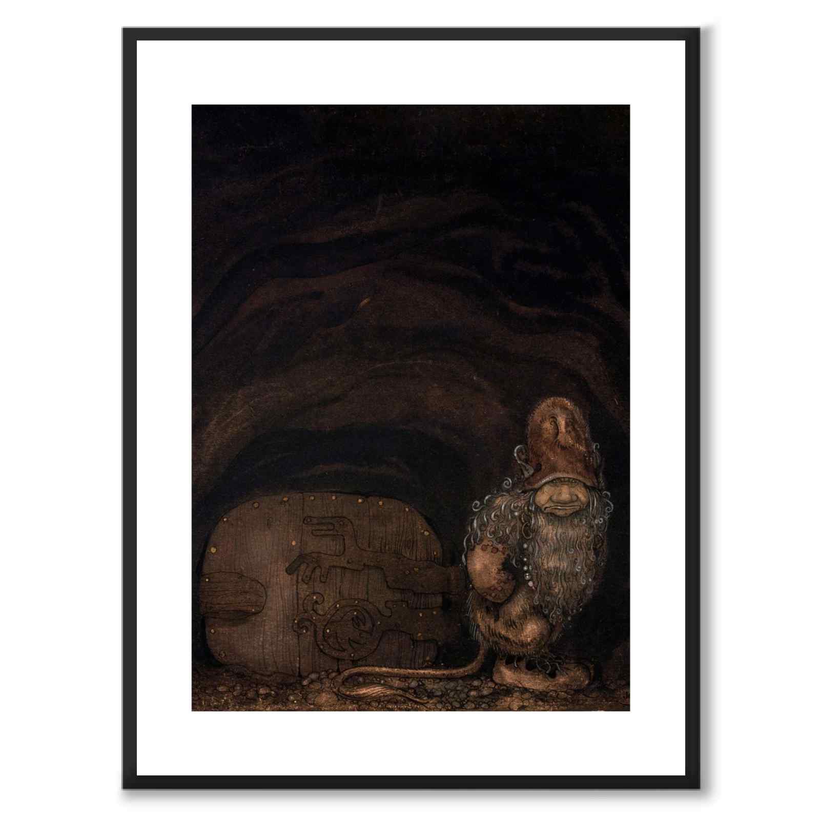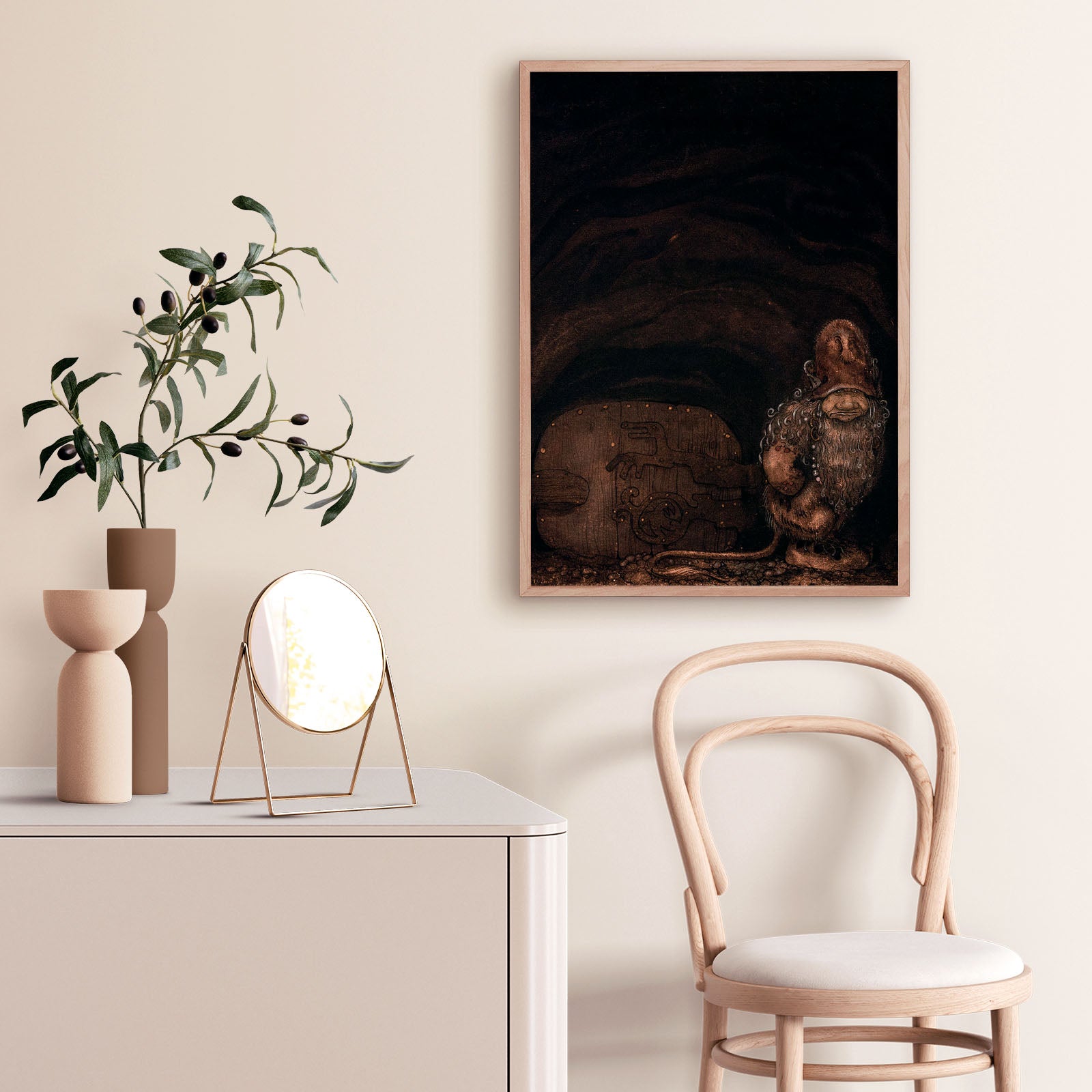 Plakat med maleriet Han ble grettenere og grettenere ettersom tiden gikk. John Bauer er kunstneren bak maleriet som ble utgitt med Elsa Beskows eventyr Da heksa tok seg av kongens låve i eventyrsamlingen Mellom Tomtar og troll. På bildet ser vi en trollmann utenfor porten til hjemmet sitt - trollfjellet. John Bauer er kjent for sine eventyrmotiver med troll og prinsesser og han har hatt stor innflytelse på svensk folklore og historiefortelling.