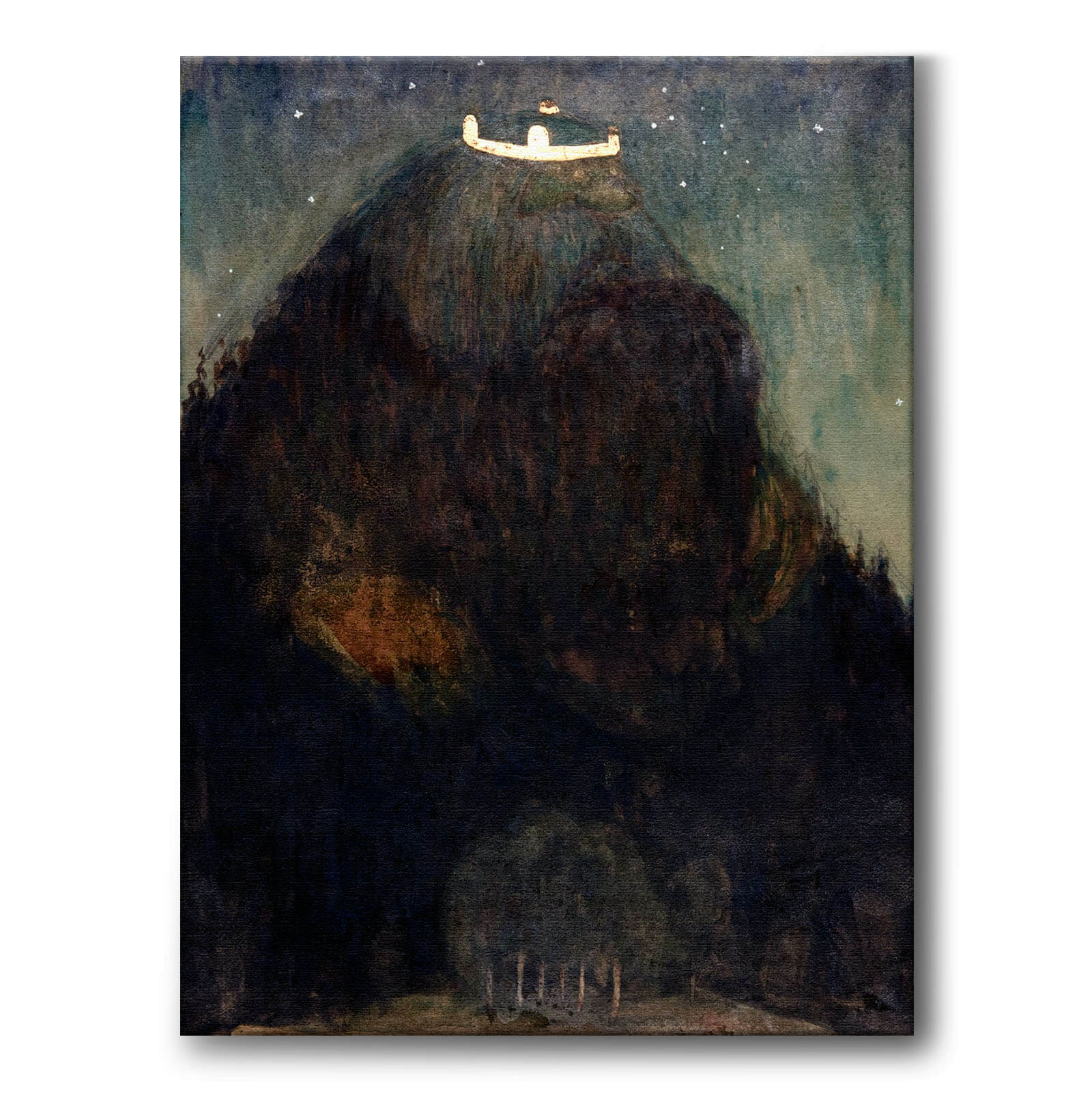 Lerretsmaleri med maleri av John Bauer som viser et stort troll iført en kongekrone. Den sammenkrøpte og mystiske skikkelsen ser ut som et stort og skogkledd fjell.