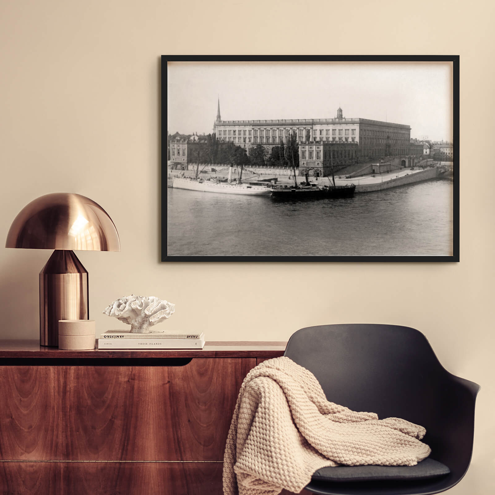 Plakat med Stockholm på slutten av 1800-tallet. Bildet er tatt fra Grand Hotel mot Stockholms slott.