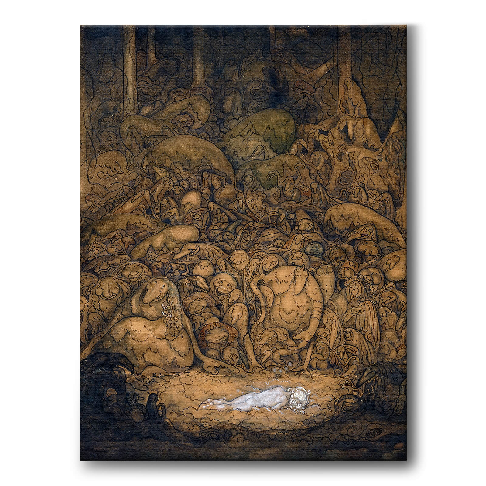 Lerret med maleriet Rottrollen av John Bauer fra 1917. Et barn ligger i en lysning i skogen omgitt av rotlignende troll. Trollet går nesten i ett som en del av naturen og skaper et eventyrbilde av skandinavisk natur og skog.