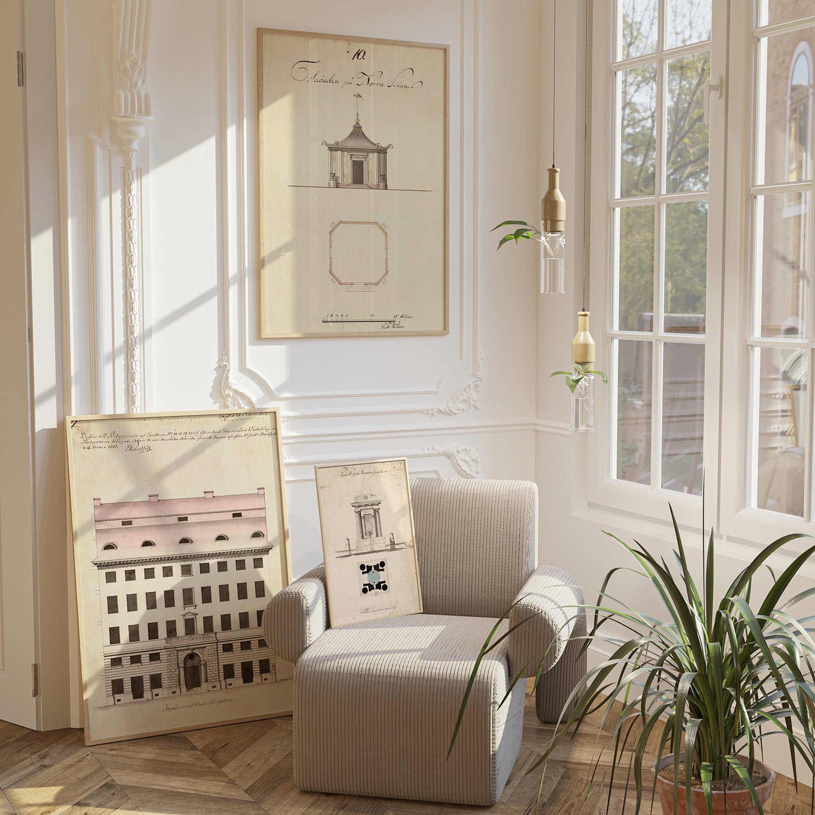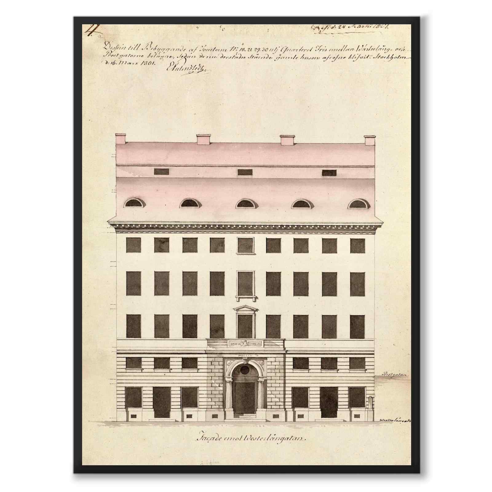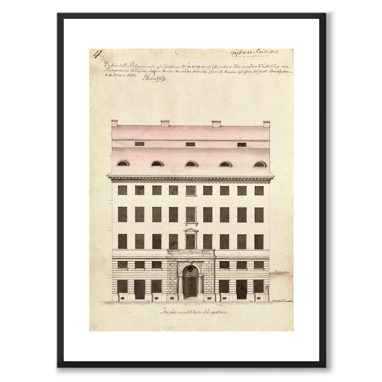 Plakaten viser en tegning av et hus tegnet av Erik Palmstedt for seg selv og familien i 1801. Dette var et av de siste prosjektene i karrieren. Palmstedt, en av Sveriges mest fremtredende arkitekter på 1700- og 1800-tallet, skapte denne bygningen på Västerlånggatan 27 i Stockholm.