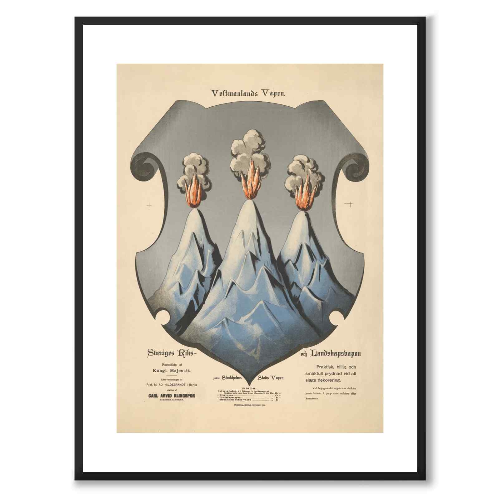 Teksten over våpenskjoldet lyder: Vestmanlands våpen . Nederst til venstre står det: "Sveriges National- og Landsvåpen. Etablert av Kongelig Majestet. Etter tegninger av Prof. M. AD. Hildebrandt i Berlin. Utgitt av Carl Arvid Klingspor."