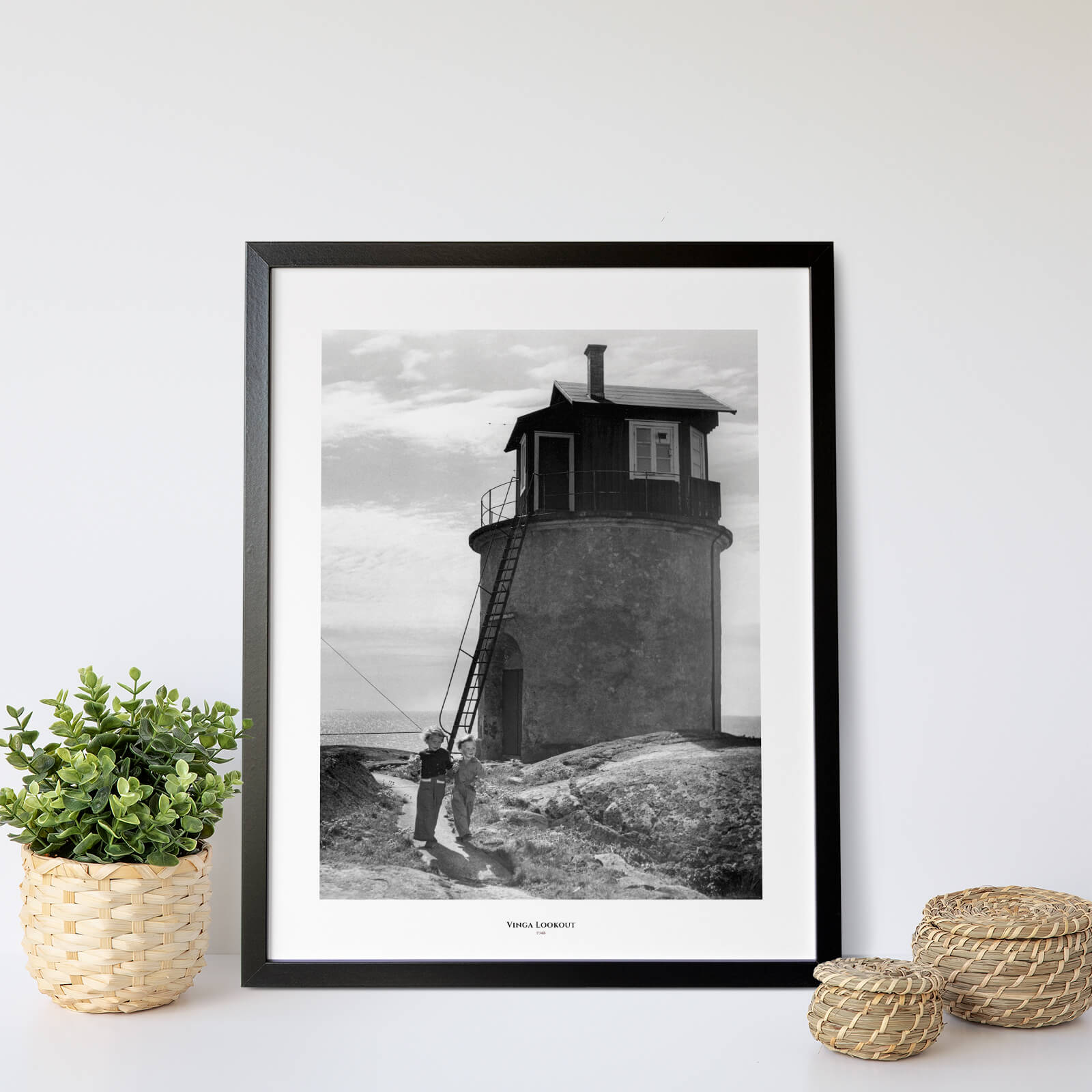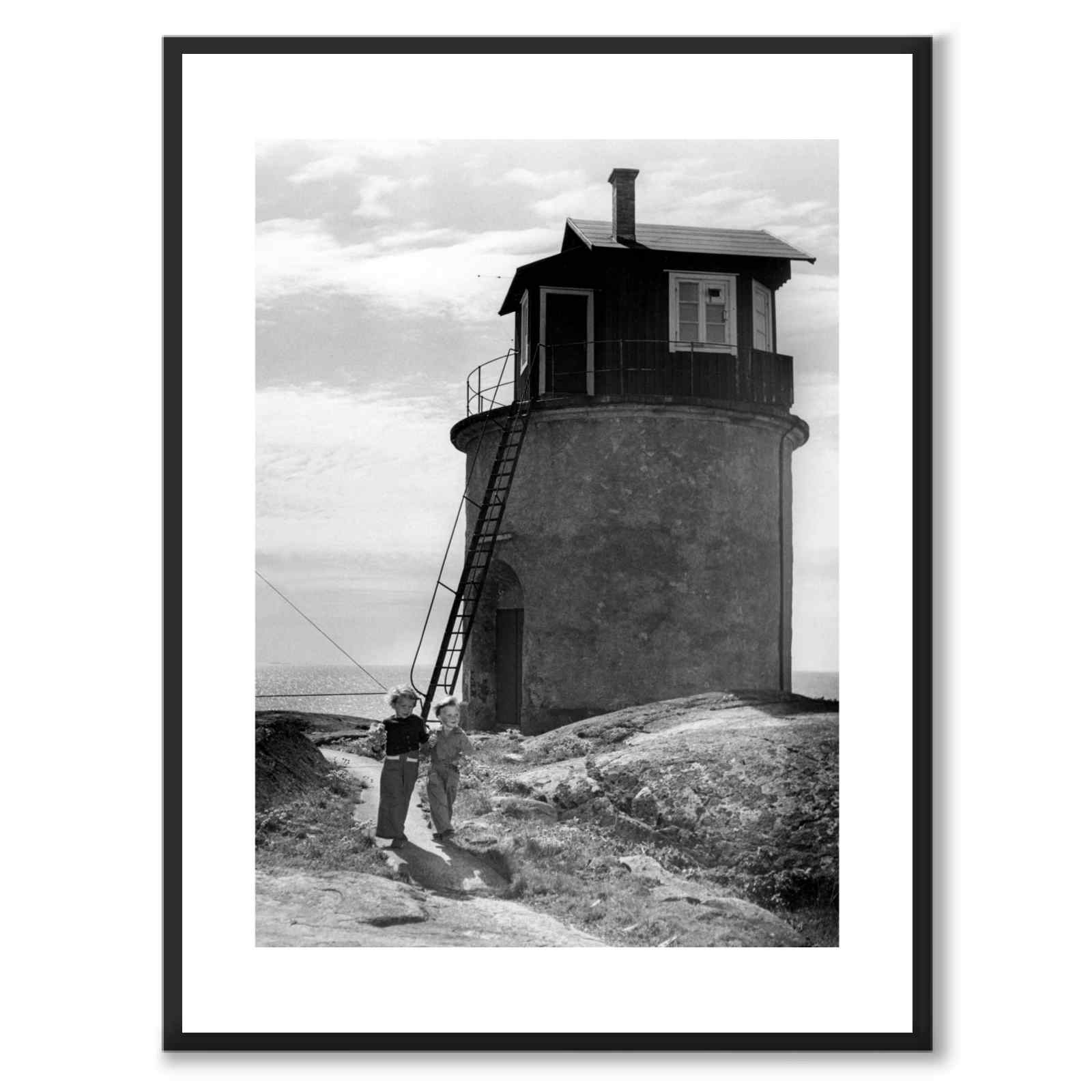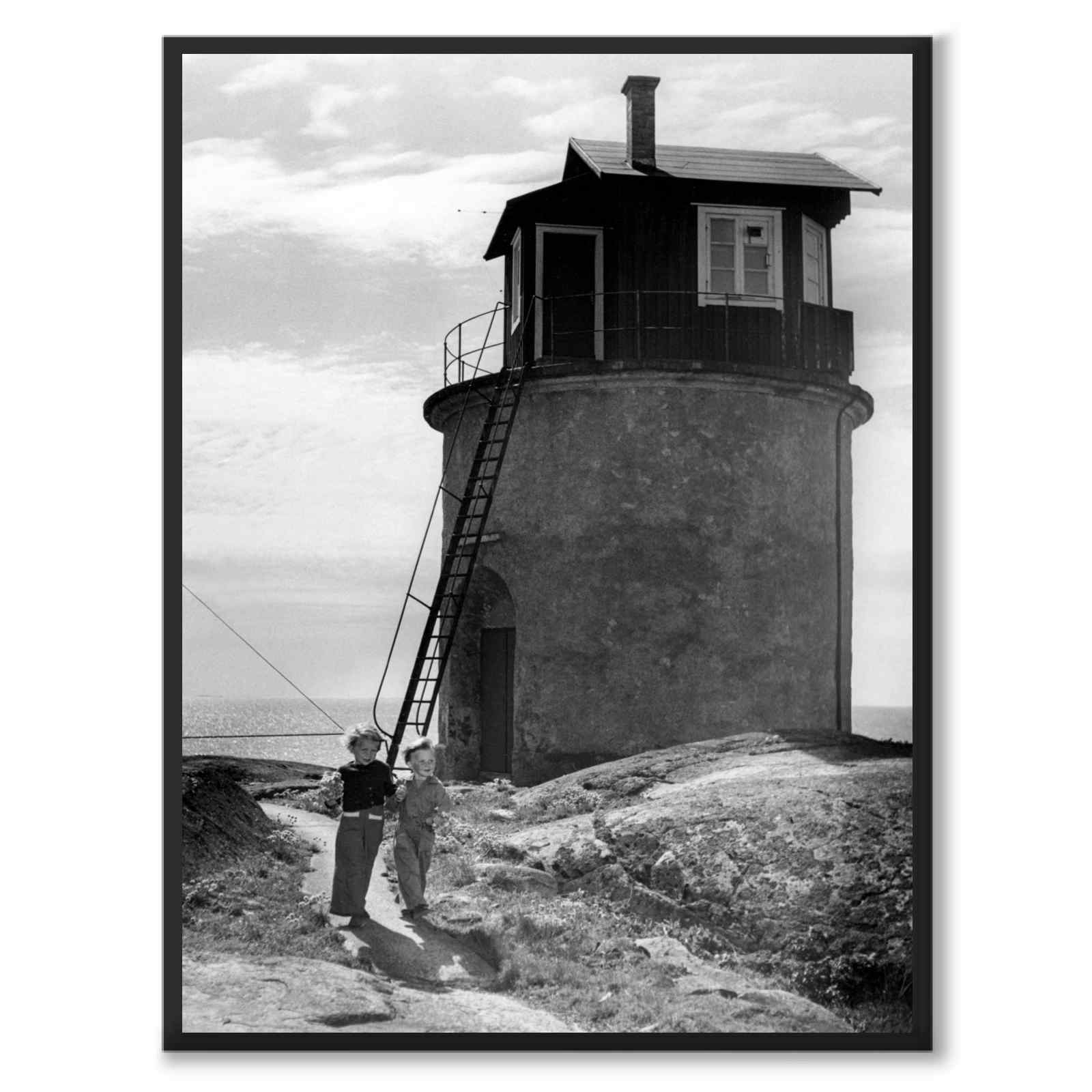 Plakat med et helt fantastisk øyeblikksbilde av Lotsutkiken på Vinga og to små barn som har plukket blomster. Vinga er et fyrtårn i Gøteborgs skjærgård og bildet er tatt i 1948.