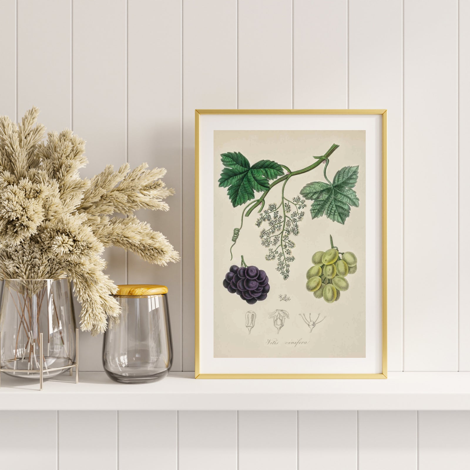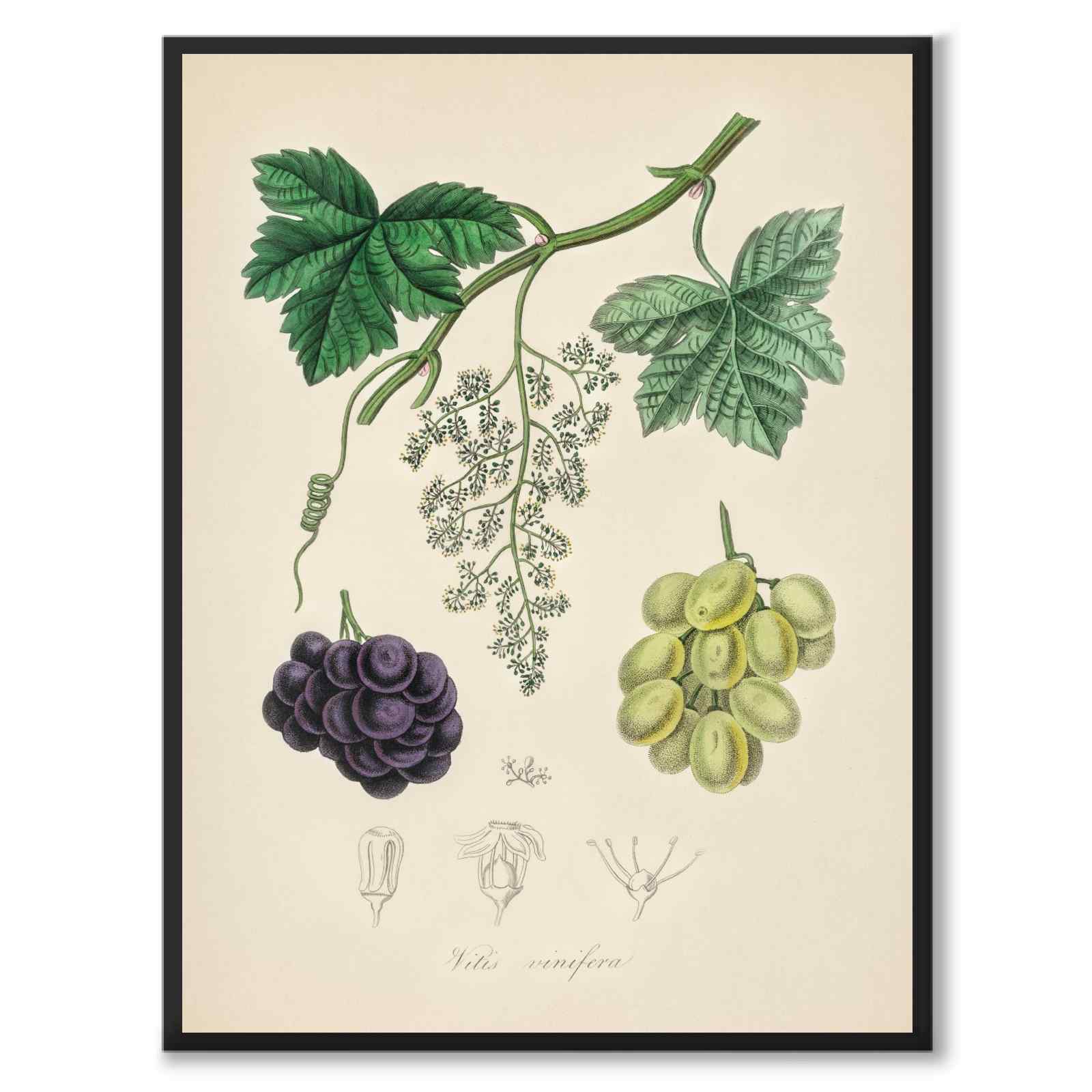 Plakat med en klassisk illustrasjon av druer og en vinranke, på latin Vitis vinifera , fra 1800-tallet.