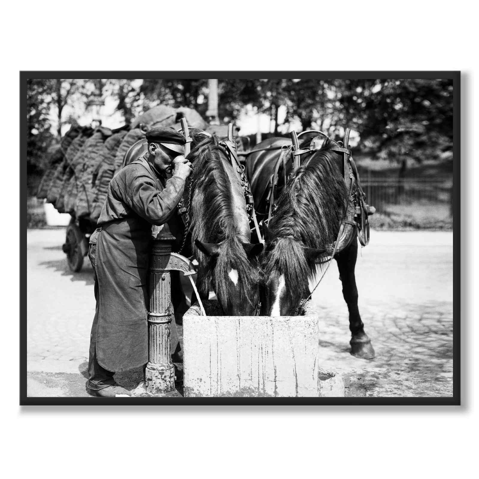 To hester og en mann drikker ved en vannfontene. Bildet er tatt under en hetebølge i Stockholm i 1934.