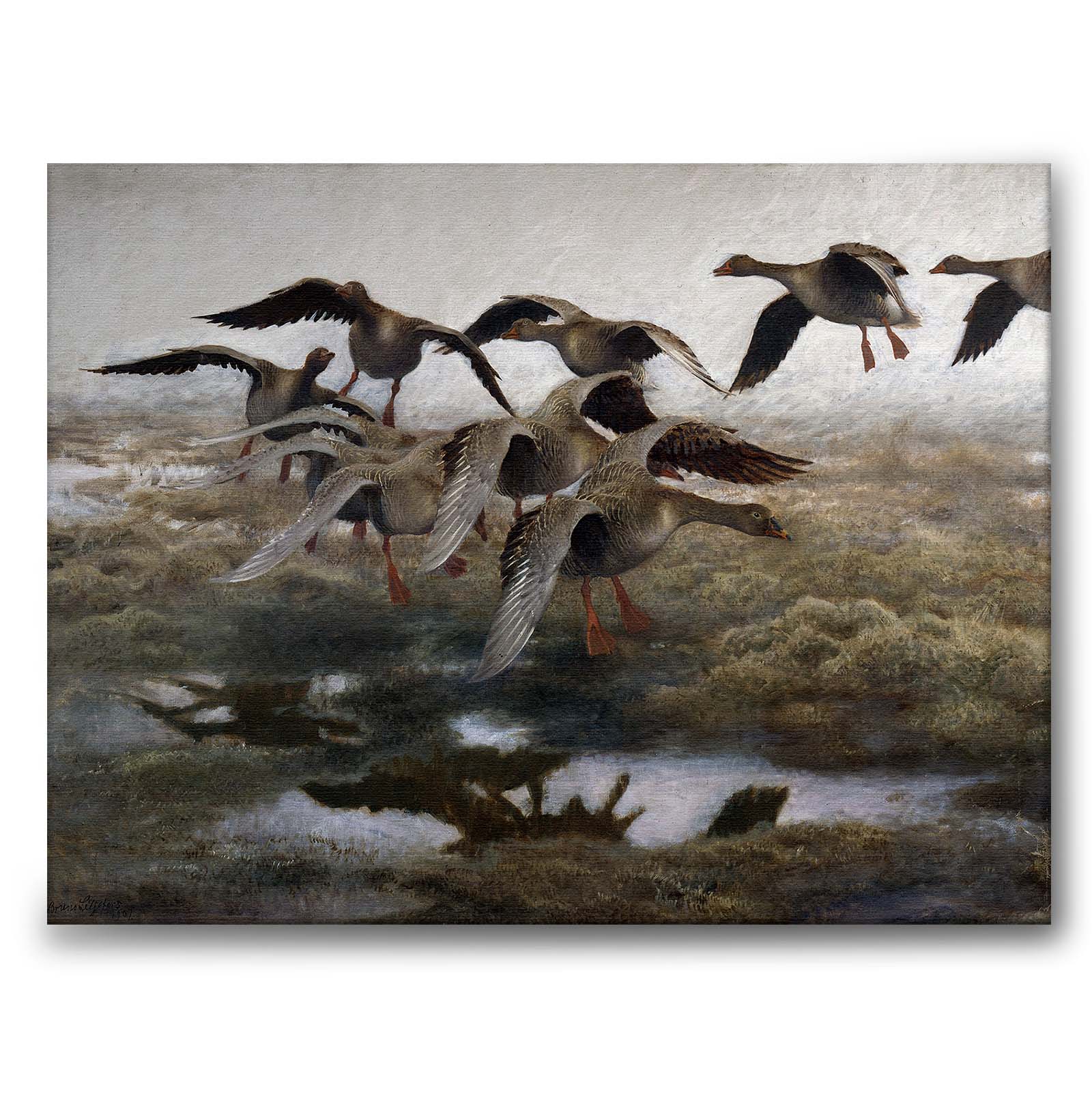 Eksklusivt lerretsmaleri med et vakkert maleri fra 1907, malt av Bruno Liljefors. Motivet viser en flokk med villgjess som lander på en vakker myr på en tåkete dag.