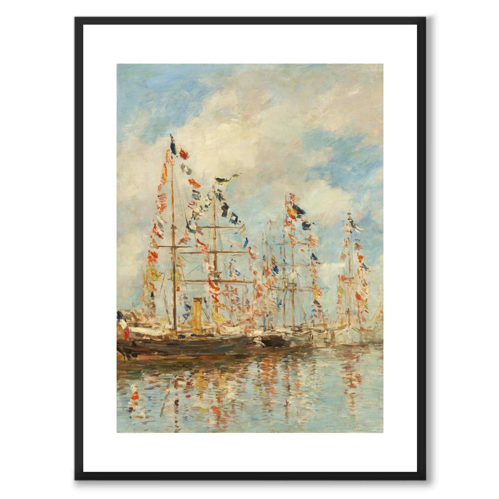 På bildet ser vi flere seilbåter fulle av forskjellige flagg. Boudin har laget en vakker fargeskala med seilbåtenes flagg som også reflekteres i det stille vannet.