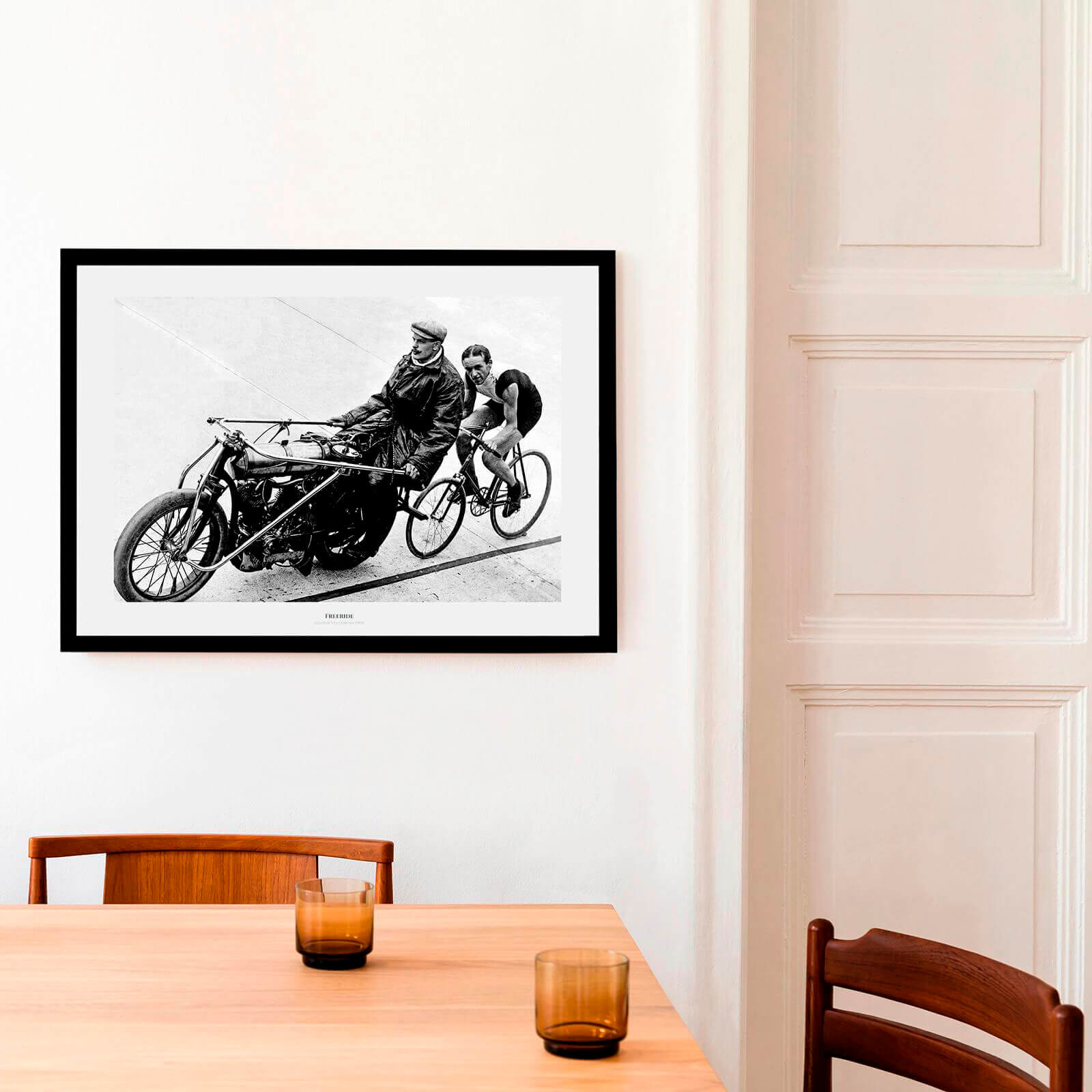 En motorcyklist agerar föråkare till elitcyklisten Andrew Hansson som ligger tätt bakom. Bilden är tagen år 1908 på en dansk velodrom. En velodrom är en oval och lutande bana för tävlingscyklister och farten kunde nå upp till hela 110 km/h vilket såklart var riskfyllt, speciellt eftersom varken motorcyklisten eller cyklisten hade några skydd.