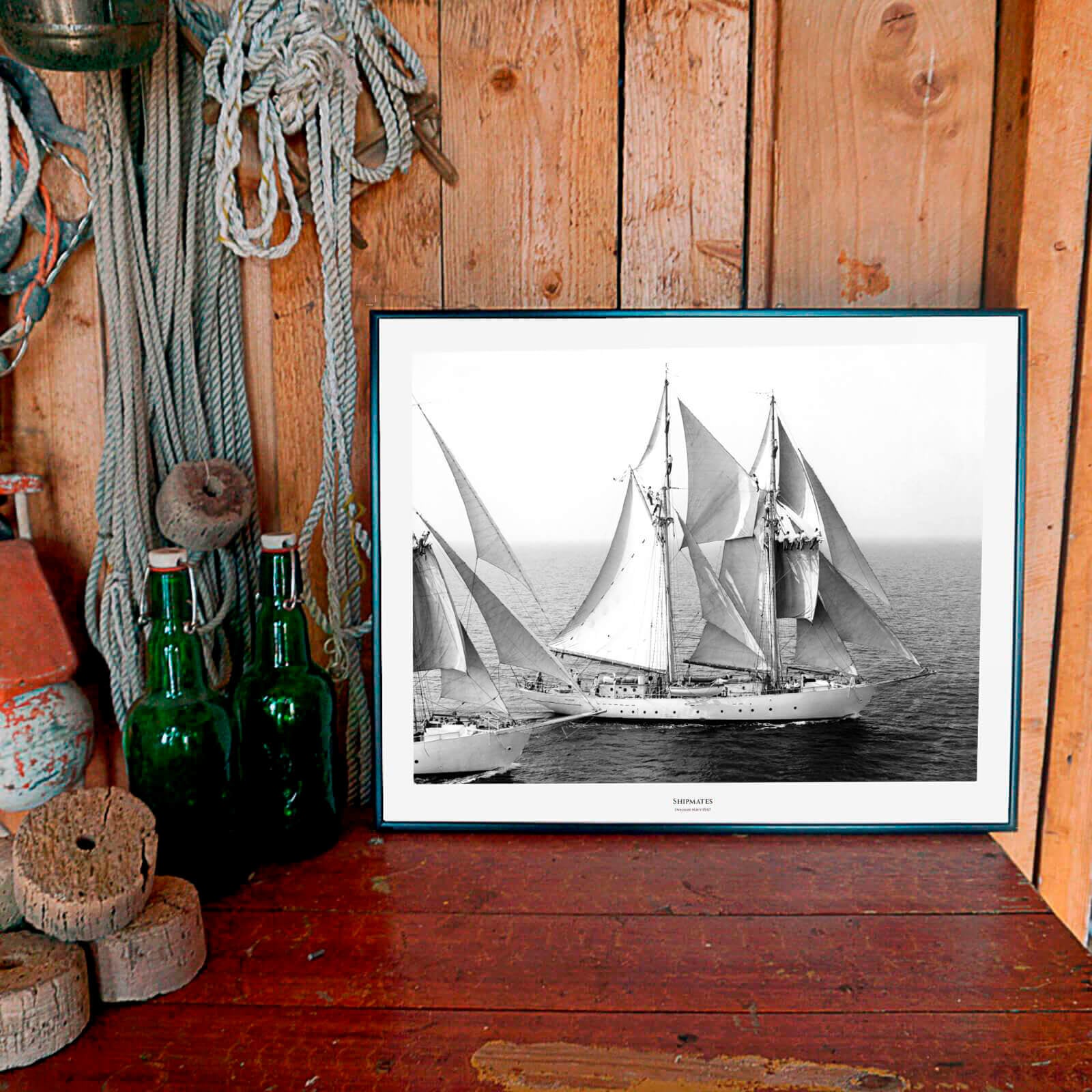 Flygbild av svenska flottans skolskepp Gladan och Falken till havs. Båda fartyg har alla segel satt och gör måttlig fart. Från Gladan ser man bara förskeppet på bildens vänster sida. I riggen arbetar sjömän med att sätta eller bärga segel. Skolfartygen användes bland annat av den svenska flottan för att utbilda sjöofficerare. "Shipmate" är en term som någon i flottan ofta använder för att beskriva en annan i flottan, oavsett rank eller skepptillhörighet.
