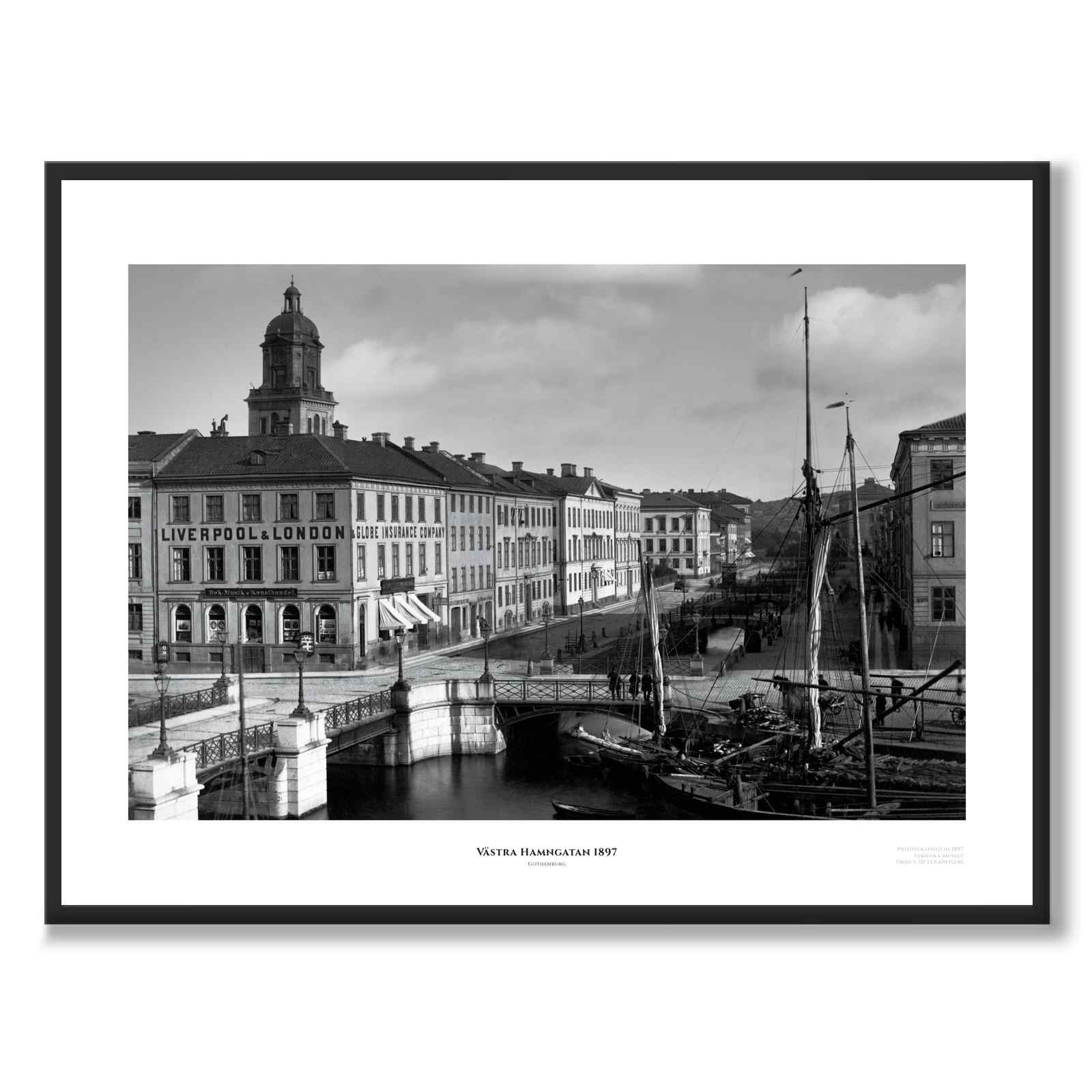 Vestra Hamngatan (Västra Hamngatan) i Göteborg år 1897. På bilden syns bland annat företaget Liverpool & London Globe Insurance Companys byggnad.