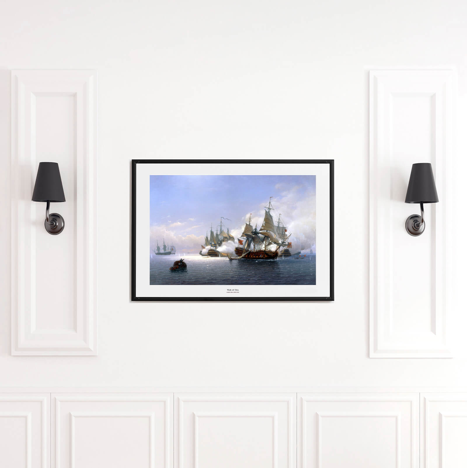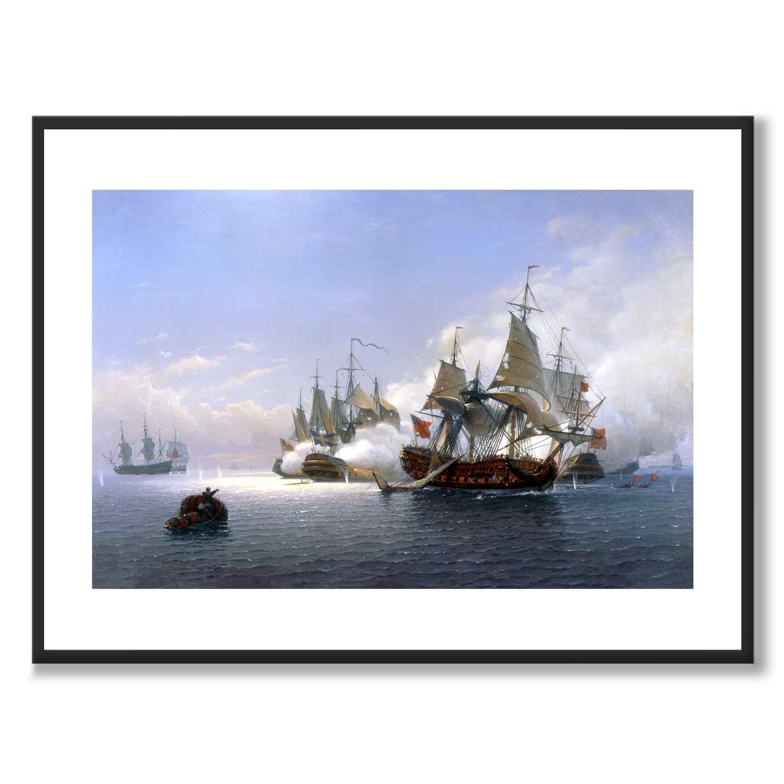 Poster med målning från sjöslaget år 1704 vid Orford Ness vid den Engelska sidan på den norra delen av Engelska kanalen.