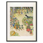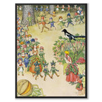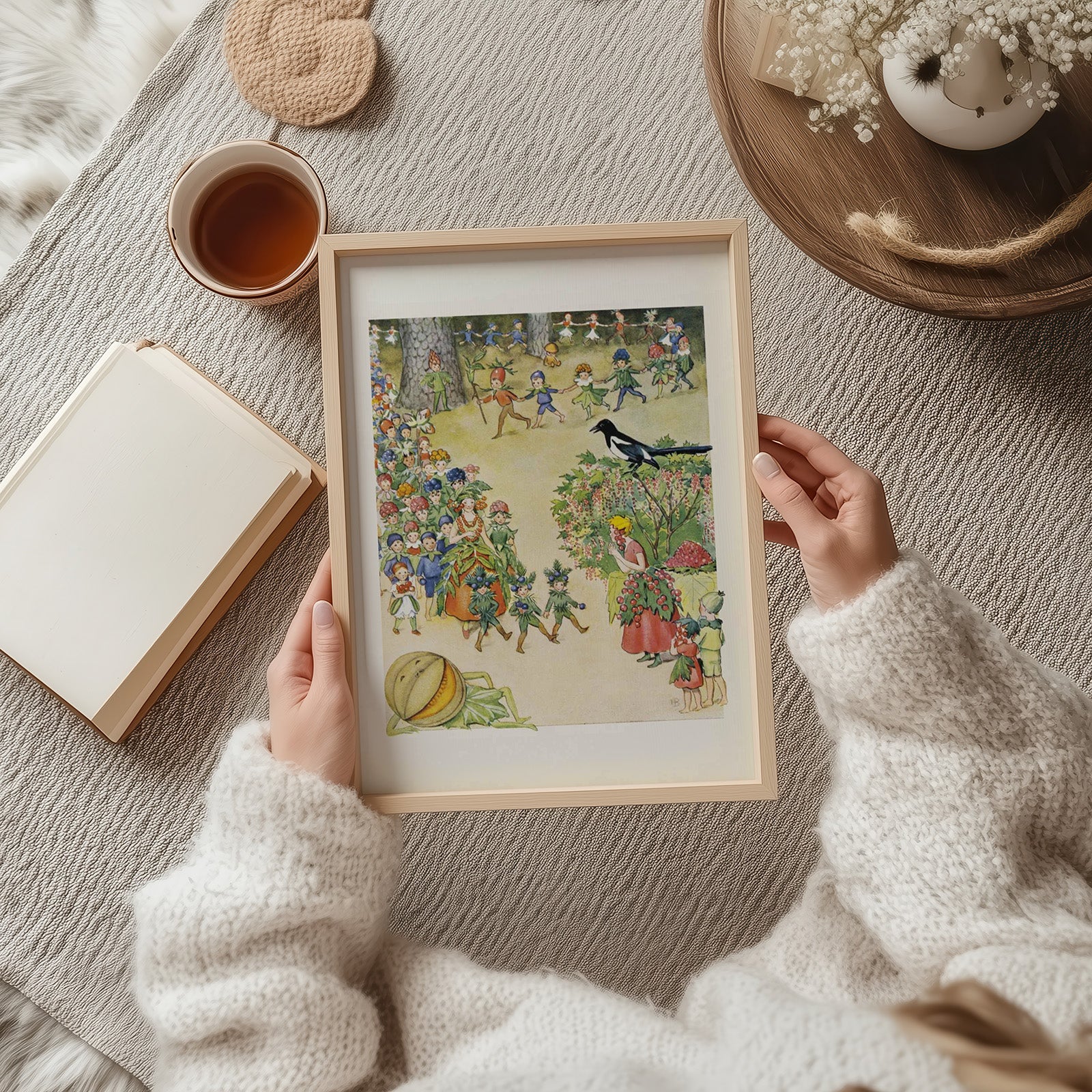 En klassisk poster illustrerad av Elsa Beskow ur Årets Saga år 1927 med motivet Augusti.
