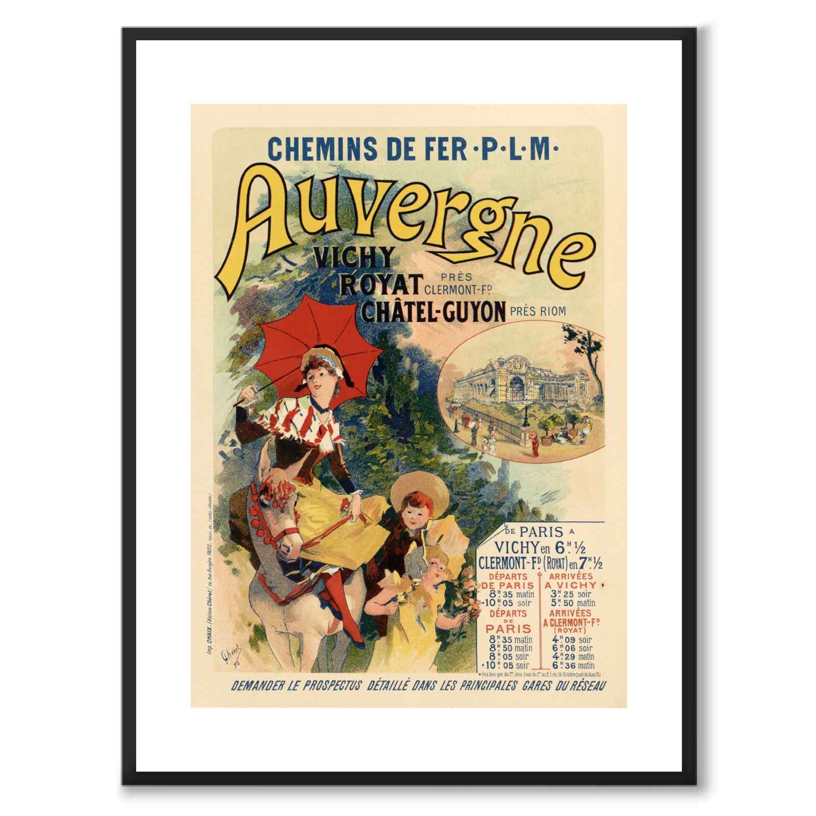 Affischen marknadsförde tågresor till regionen Auvergne, särskilt till kurorter som Vichy, Royat och Châtel-Guyon, som var populära resmål under Belle Époque-perioden. Motivet visar en kvinna som håller ett rött parasoll och rider på en åsna, omgiven av barn i tidsenlig klädsel. Denna affisch är en del av serien Les Maîtres de l’Affiche, en samling av 240 affischer som publicerades mellan 1895 och 1900 för att bevara och sprida verk av framstående affischkonstnärer.