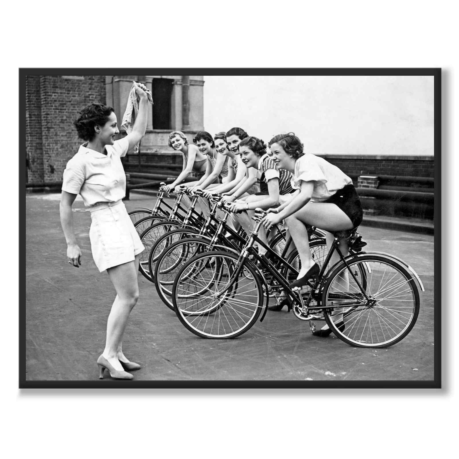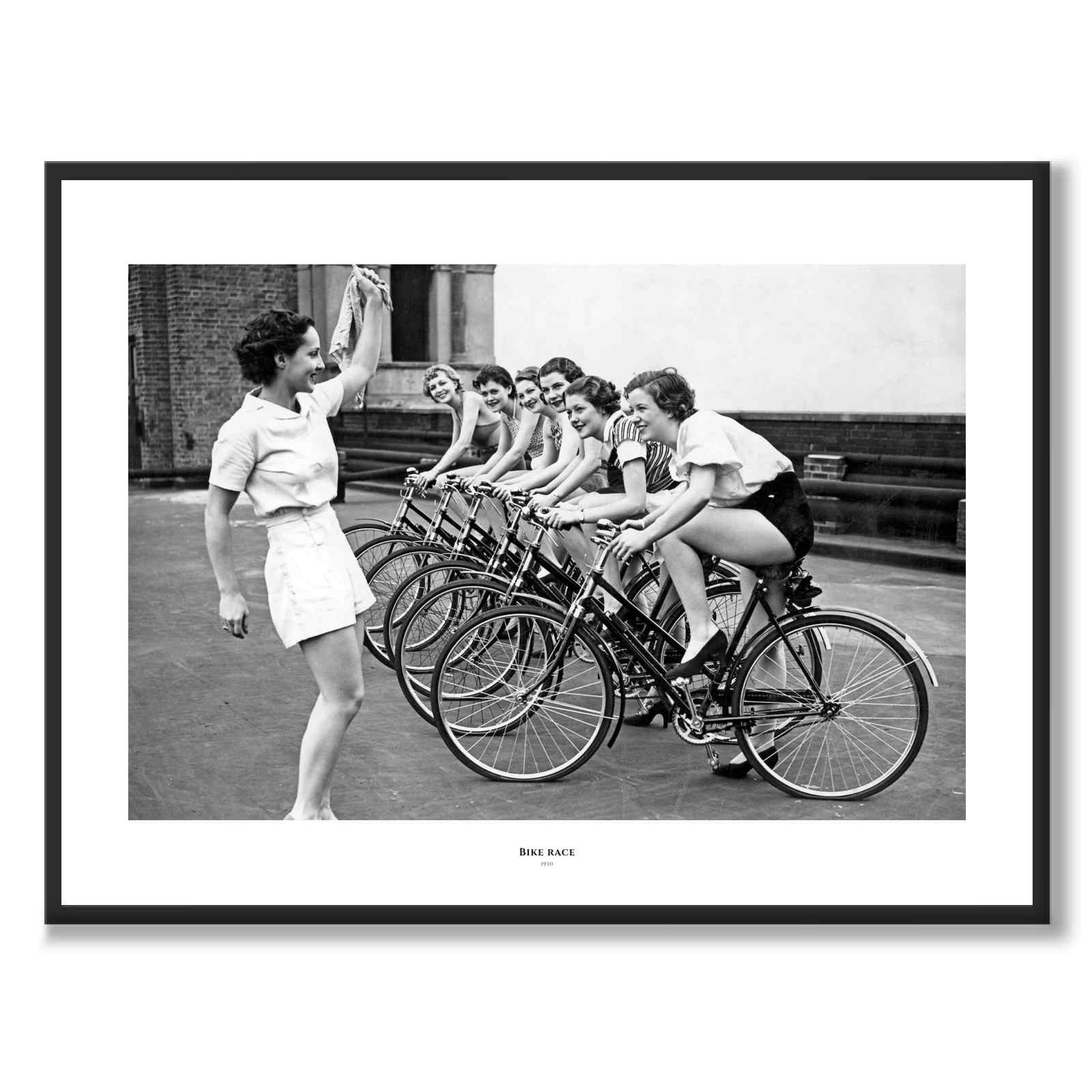 Poster med ett vintage fotografi av kvinnor inför en cykeltävling under 1930-talet. På bilden ser vi kvinnorna som gör sig redo för startskottet, vilket utförs av en kvinna med ett tygstycke.