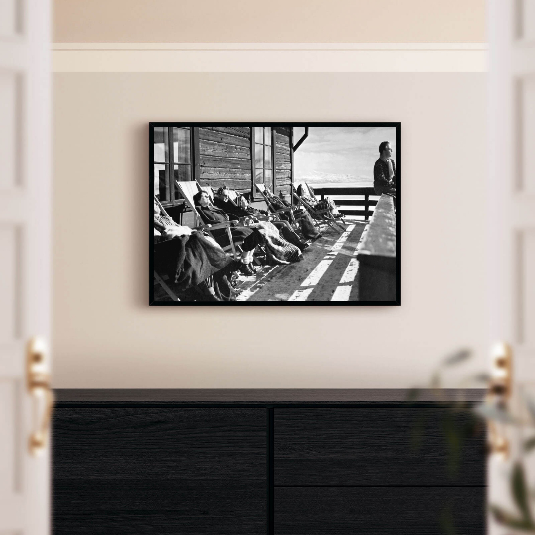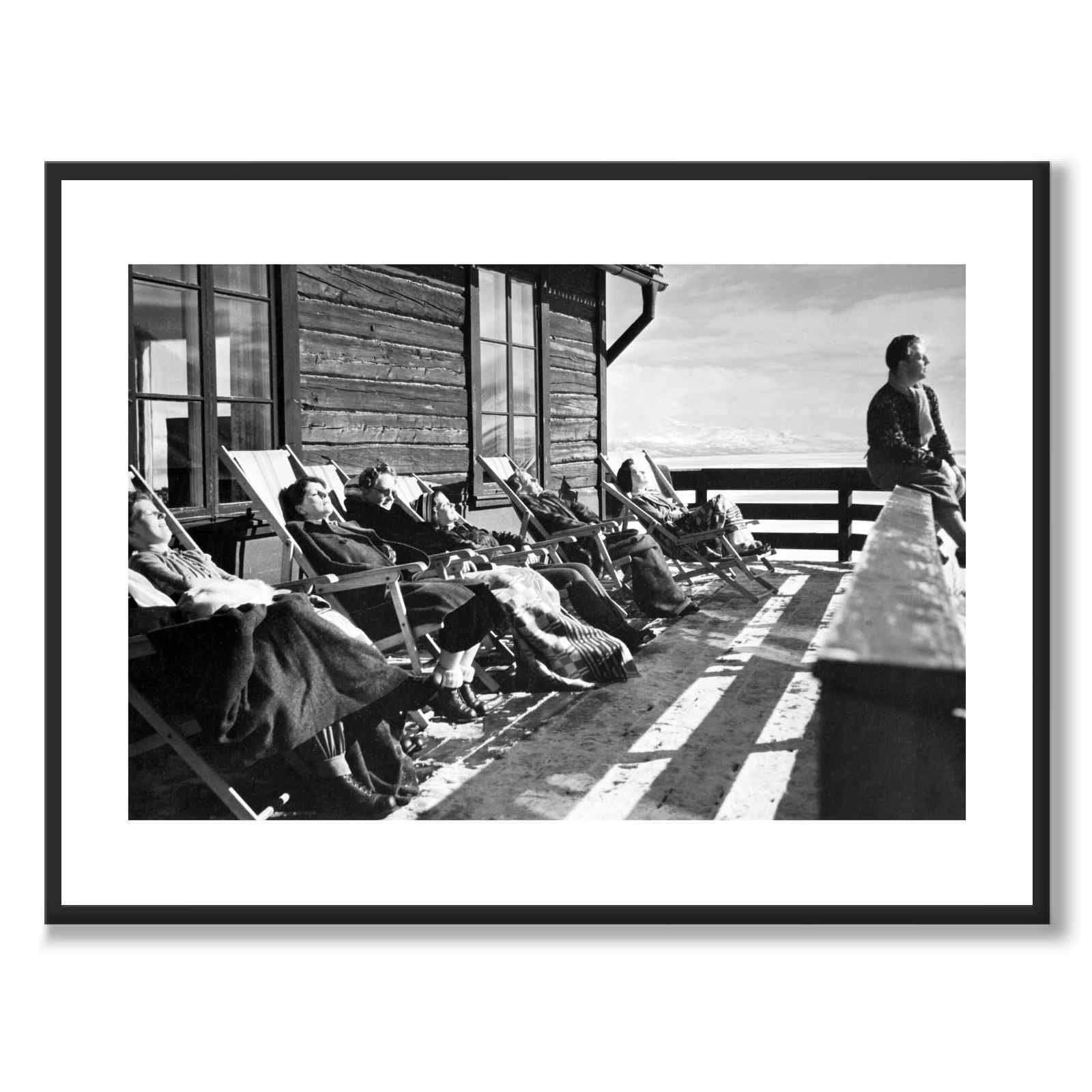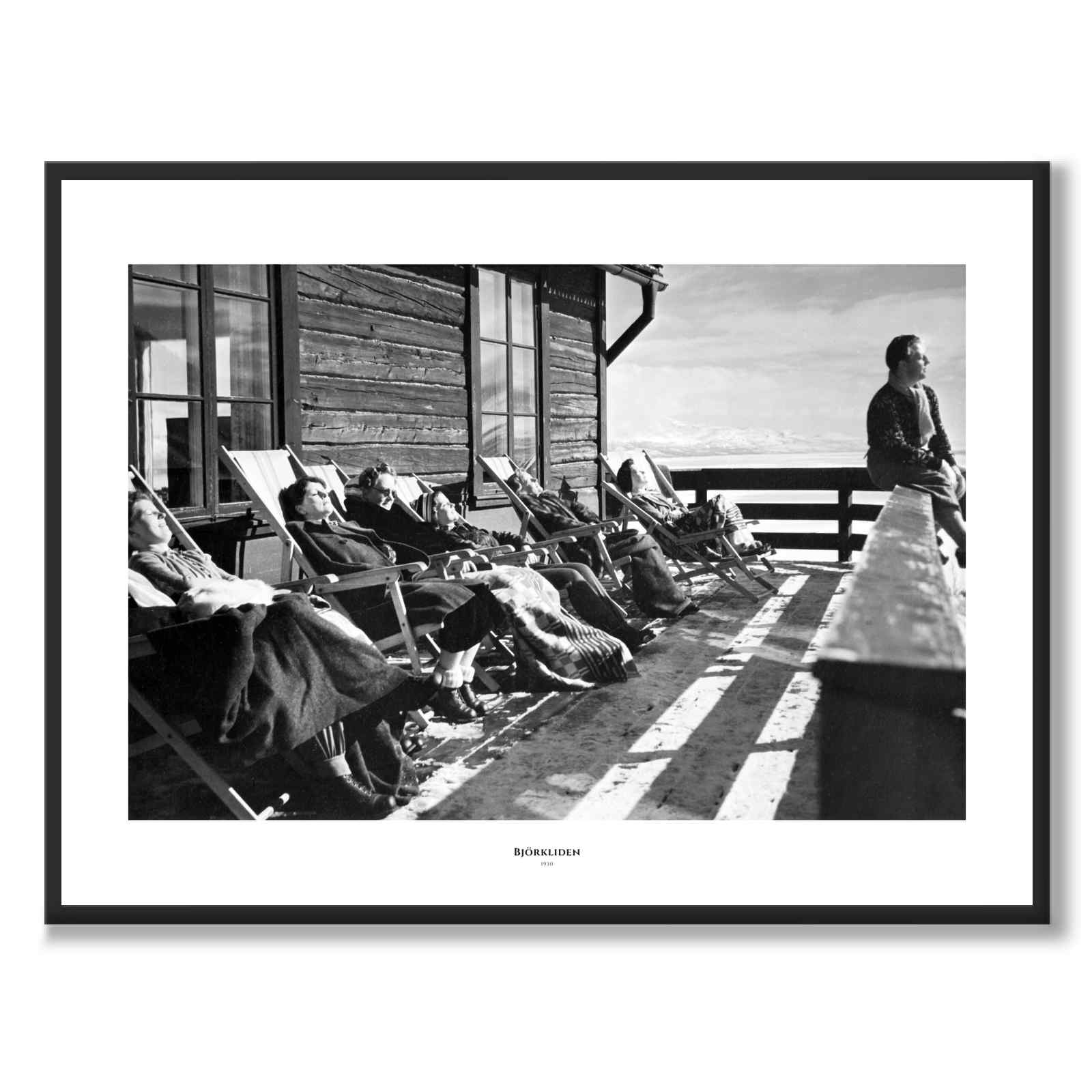 Poster med motiv från ett soligt Björkliden år 1930. Under 1930-talet växte Björkliden, en by och fjällstation i norra Sverige, till en populär destination för äventyrliga resenärer. Beläget i ett imponerande fjällandskap erbjöd Björkliden aktiviteter som vandring, fiske och skidåkning under både sommar och vinter. Fotografiet visar flera av dessa resenärer avnjuta det soliga vädret i ett snötäckt Björkliden.