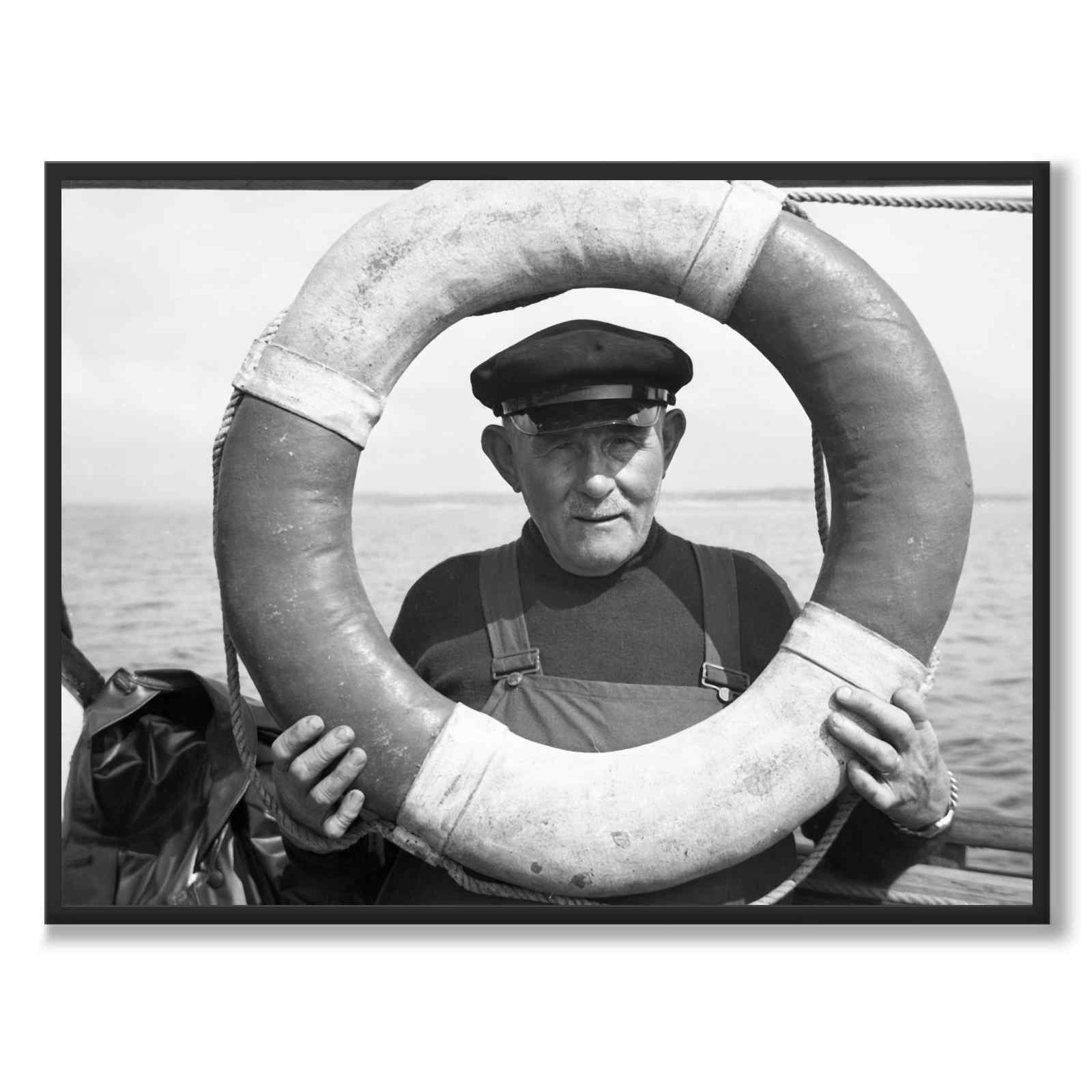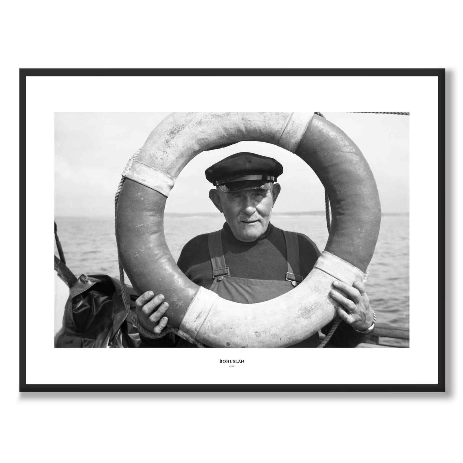 Poster med ett vackert fotografi taget av Dan Samuelson i Bohuslän under 1920-talet. Bilden är ett porträtt av en fiskare ute på vattnet, där han håller upp en livboj som en ram runt ansiktet.