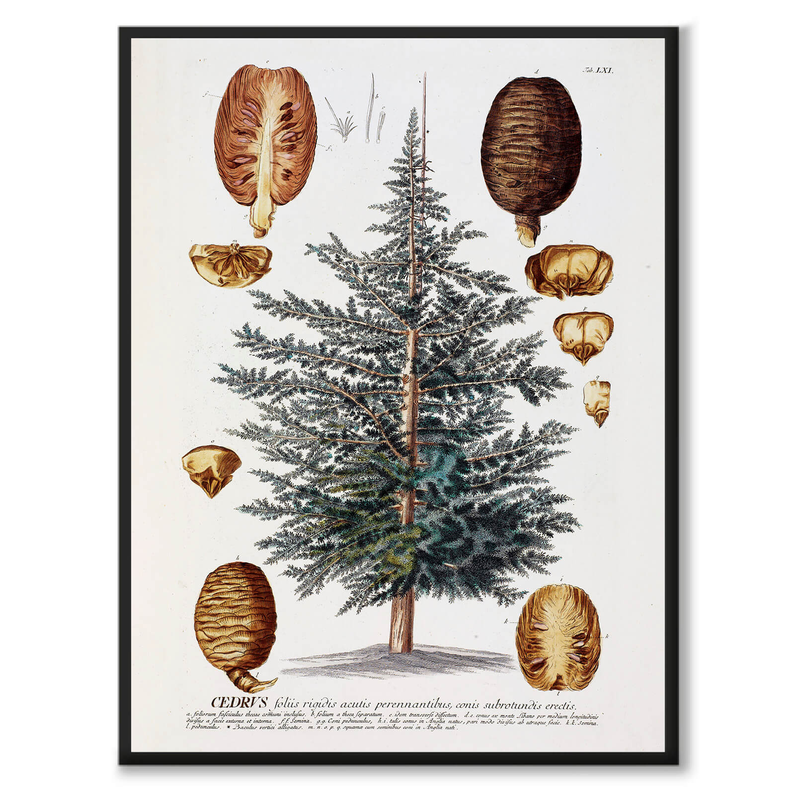 Poster med en klassisk illustration av ett cederträd från 1700-talet. På bilden ser vi en beskrivning av växten på latin.