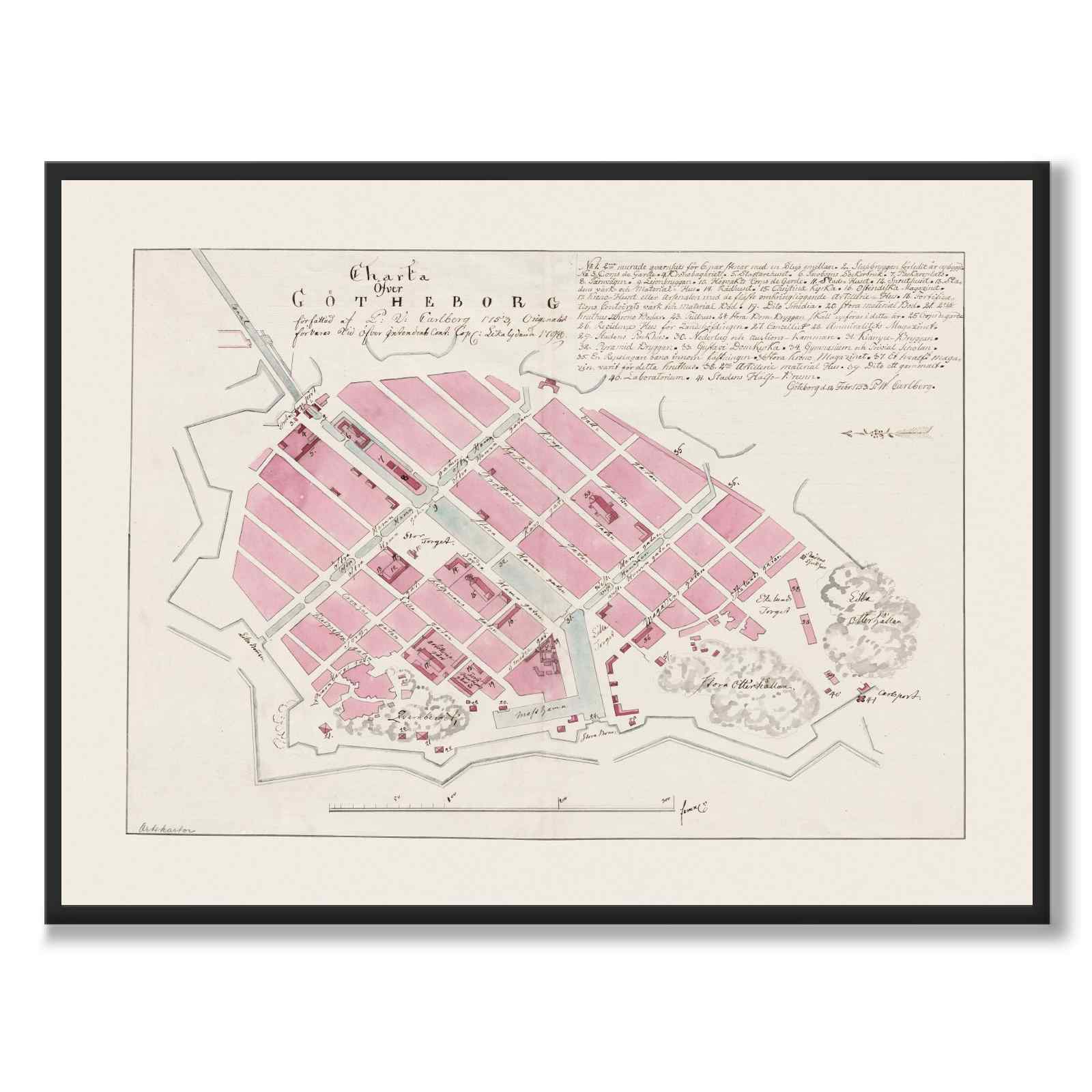 Poster med en gammal karta över Göteborg år 1798. På kartans övre kant ser vi texten: Charta öfver Götheborg : Författad af P. W. Carlberg 1753. Originalet förvaras vid Öfver intendents Cont. Cop. likalydande 1798.
