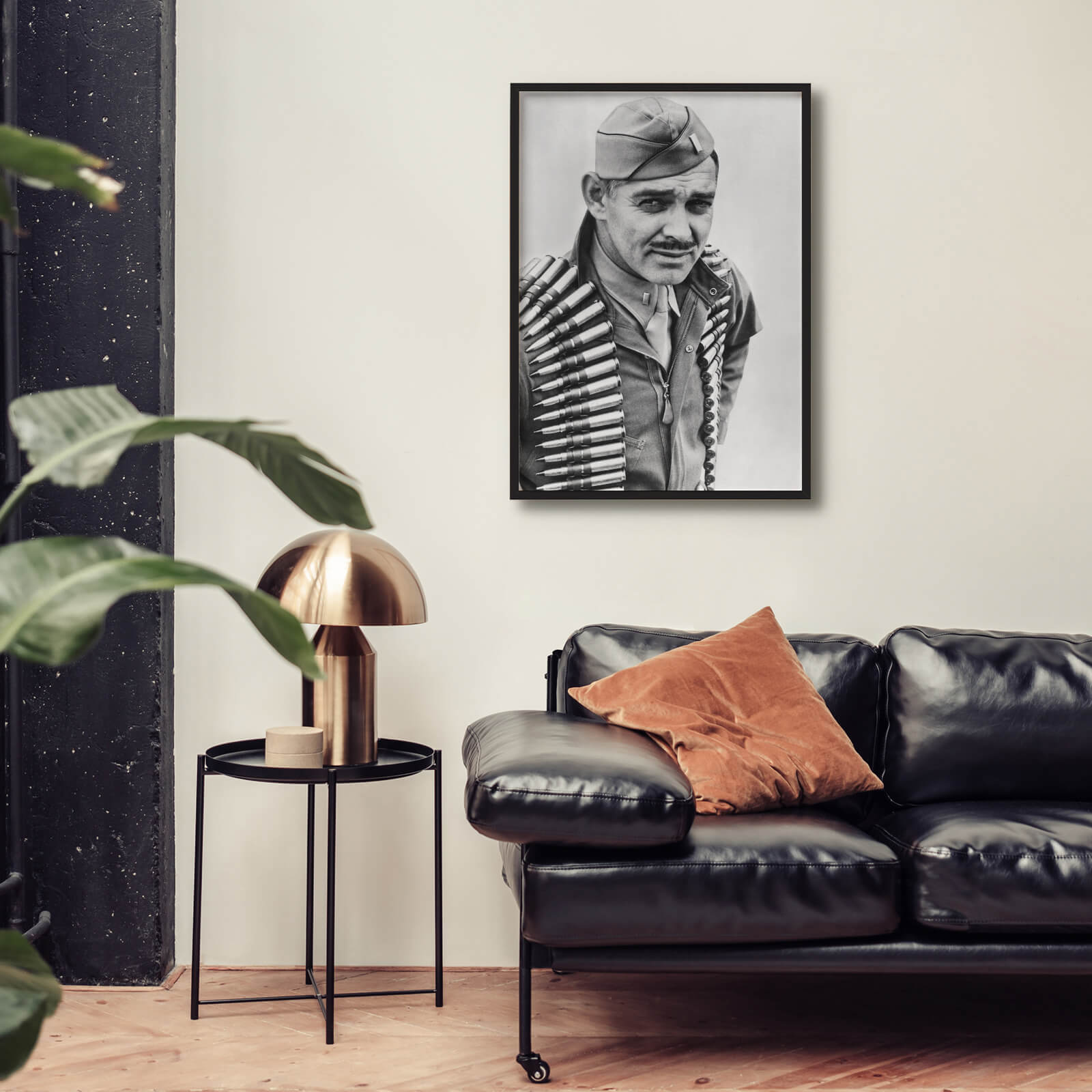 Poster med den amerikanska skådespelaren och officern Clark Gable (1901-1960), här som flygare under Andra världskriget. Han erhöll flera utmärkelser för sina skarpa uppdrag som skytt i en Boeing B-17 Flying Fortress över Tyskland.