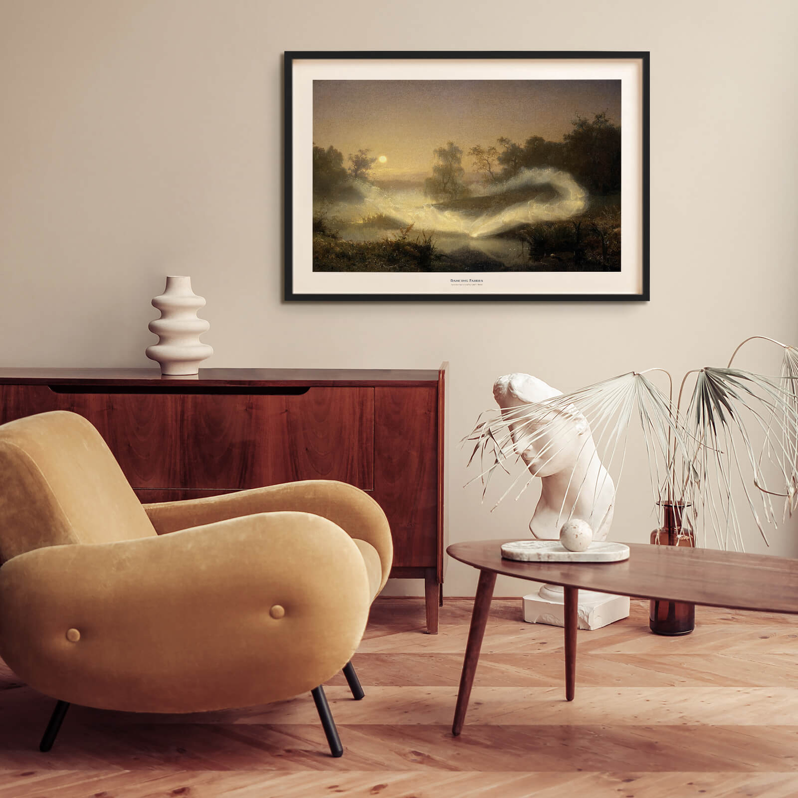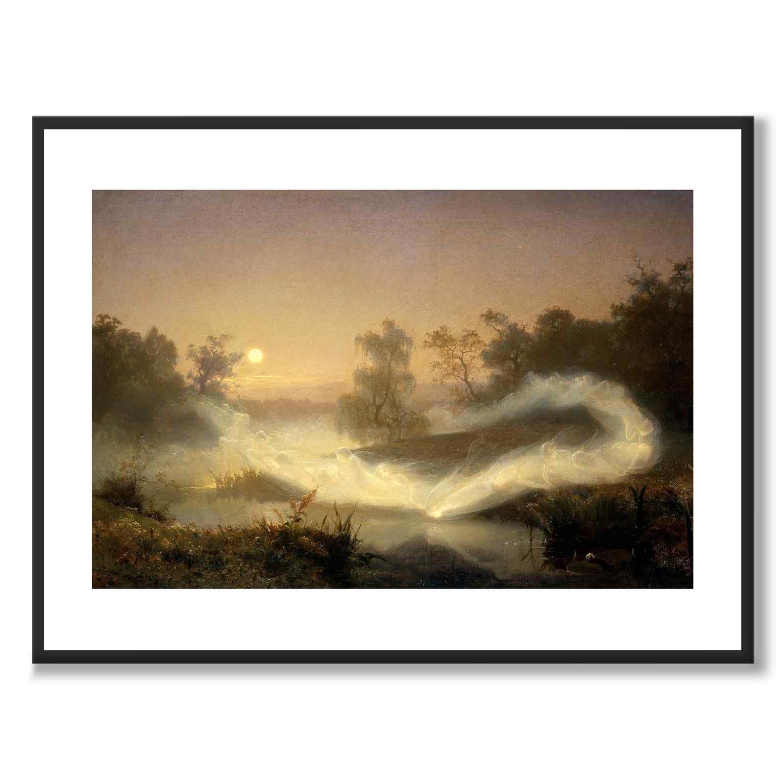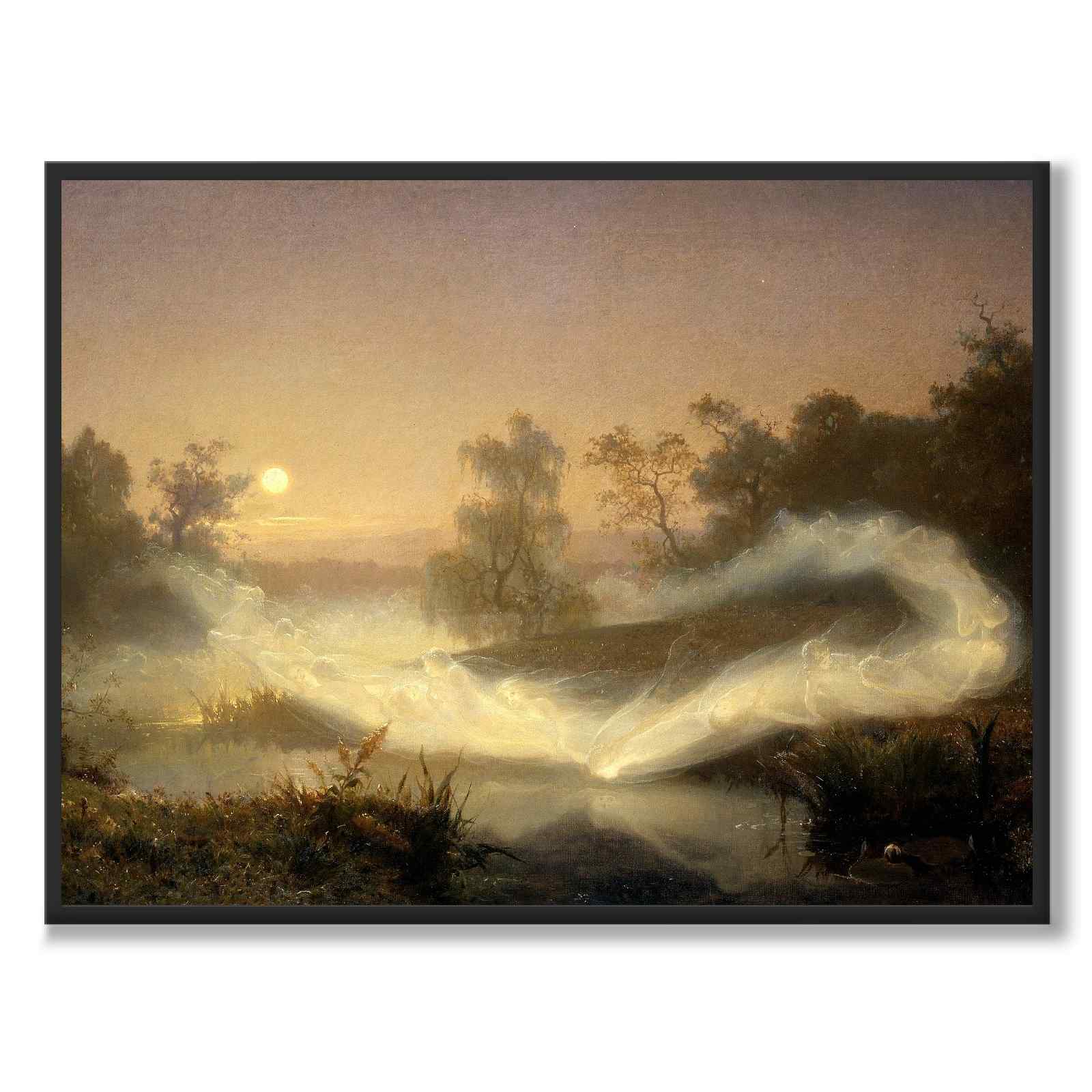 Poster med August Malmströms mest kända verk, Älvalek från 1866. Fram till och med 1872 ägdes originalet av Kung Karl XV. Målningen föreställer älvdans, ett väderfenomen där fuktig luft kondenserar och bildar mikroskopiska vattendroppar som håller sig svävande. I gammal folktro trodde man att dimman var dansande älvor. Enligt folktron levde älvor i naturen och kunde ses dansa på kullar, berg och skogar. Älvor var vackra men farliga och kunde göra människor sjuka.