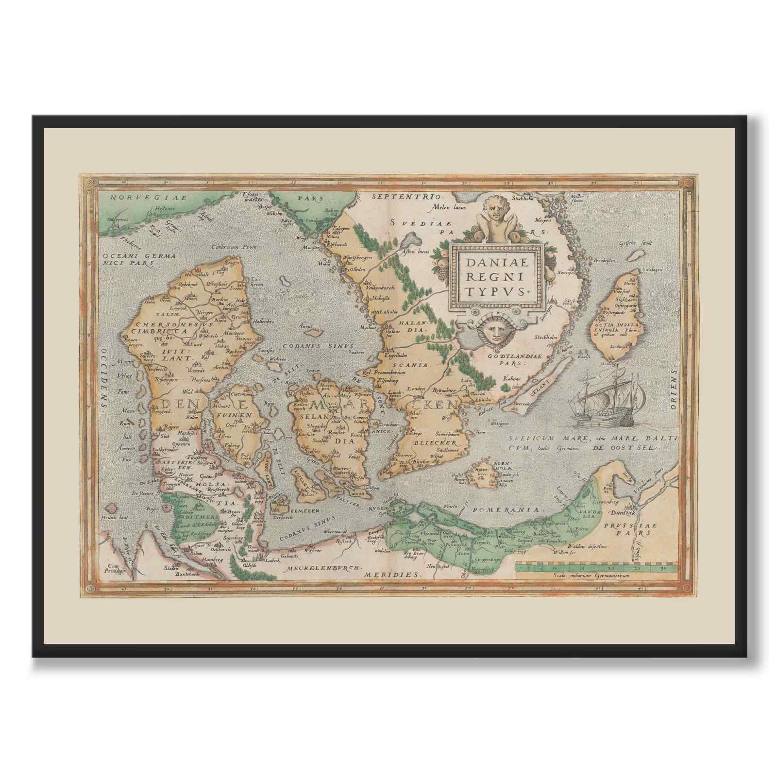 Poster med en vackert detaljerad karta vid namn Daniae regni typus. Översatt från Latin innebär det Kungariket Danmark.