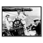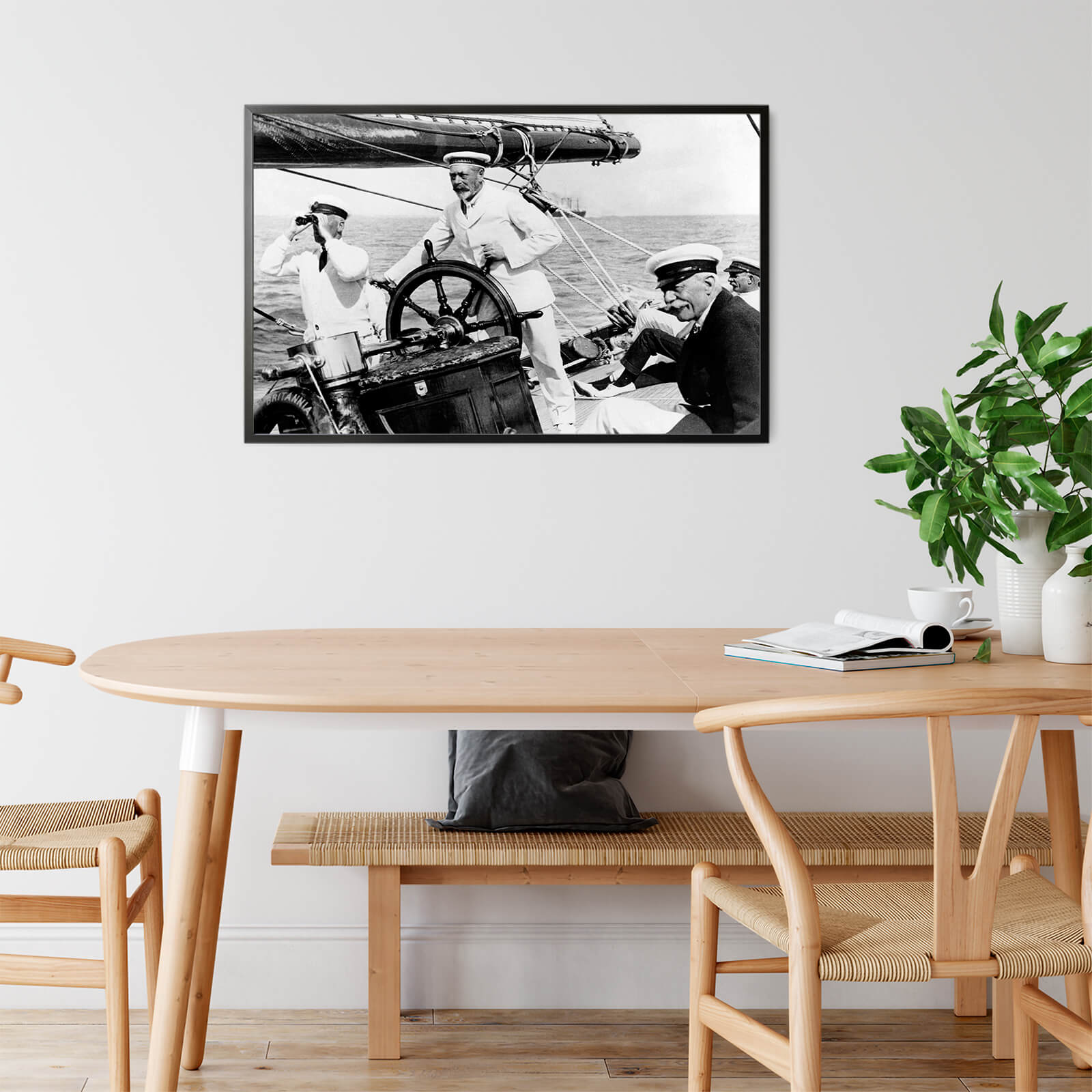 Kung George V vid rodret på sin segelbåt Britannia under Cowes Regatta Week i England år 1924. George V levde mellan 1865-1936 och var Kung av Storbritannien och kejsare av Indien.