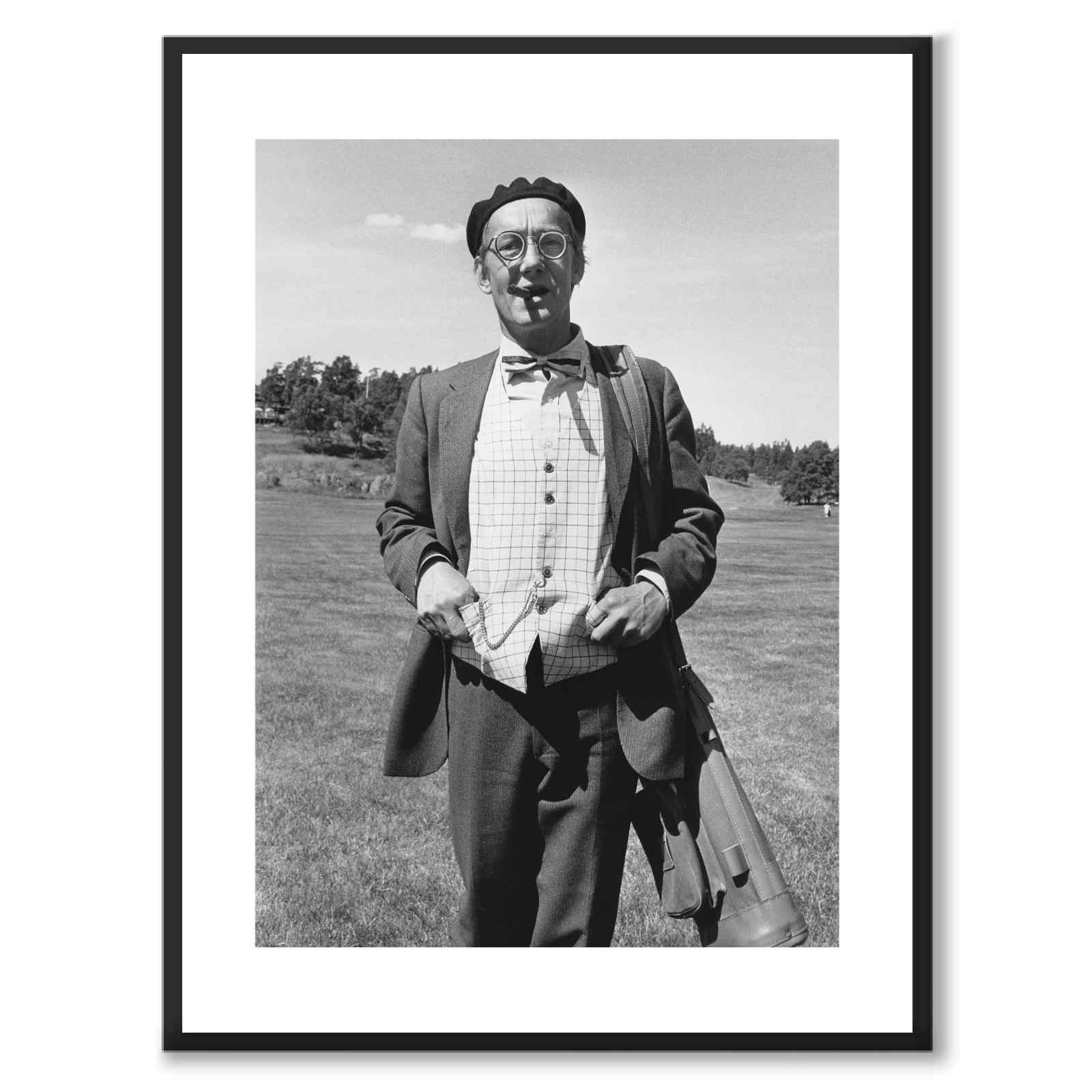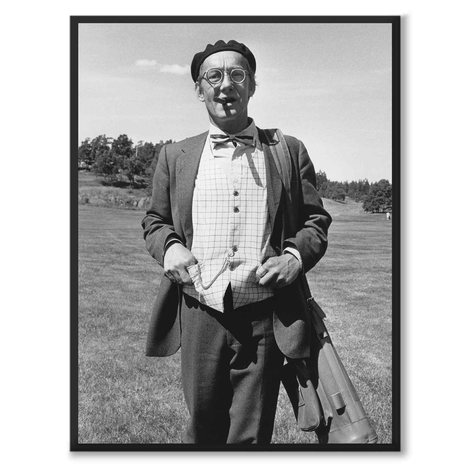 Iklädd kostym, basker och fluga med cigaretten nonchalant i mungipan står han på en gräsyta och möter kameran med en blandning av lekfull självsäkerhet och stillsam elegans. Händerna vilar vid västens kedja, och hans avslappnade hållning förmedlar samma varma karisma som gjorde honom till en av Sveriges mest älskade skådespelare.