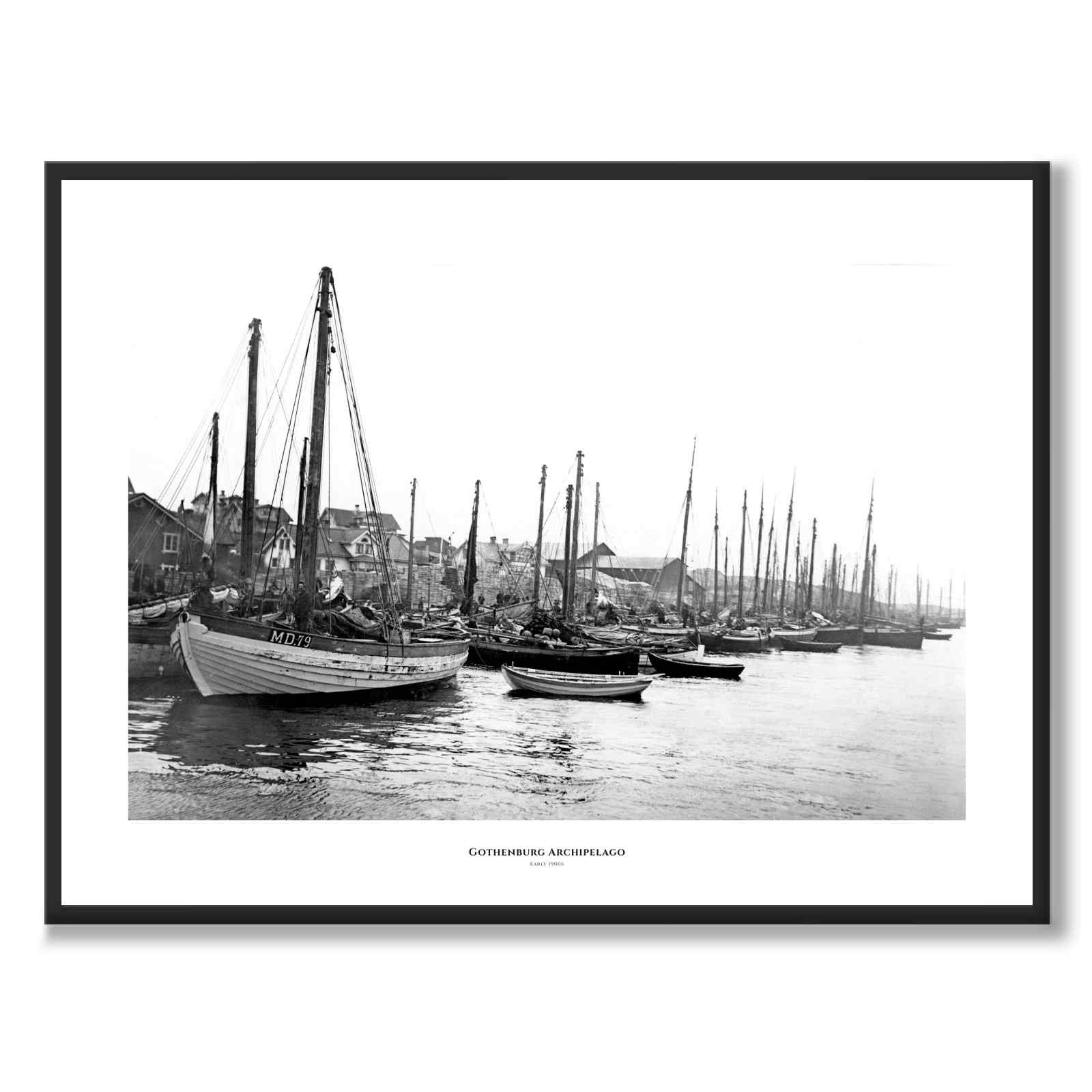 Fiskare och fiskebåtar vid en hamn i Göteborgs skärgård i början av 1900-talet. Vilken hamn kan det vara, känner du igen dig? Skriv till oss!