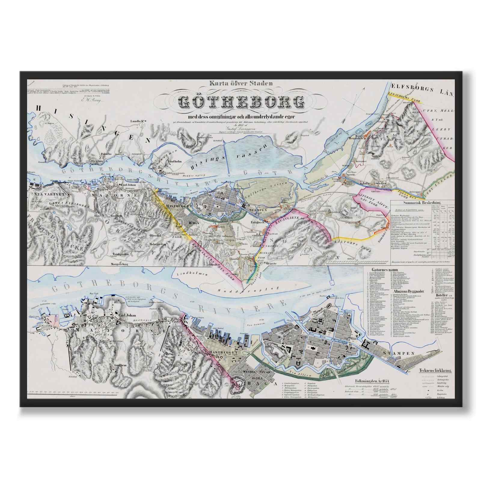 Poster med en gammal karta från 1855 över Göteborg, eller Götheborg som det då hette, och dess omgivningar. På kartan ser vi allt från Hisingen till Frölunda och Kålltorp.
