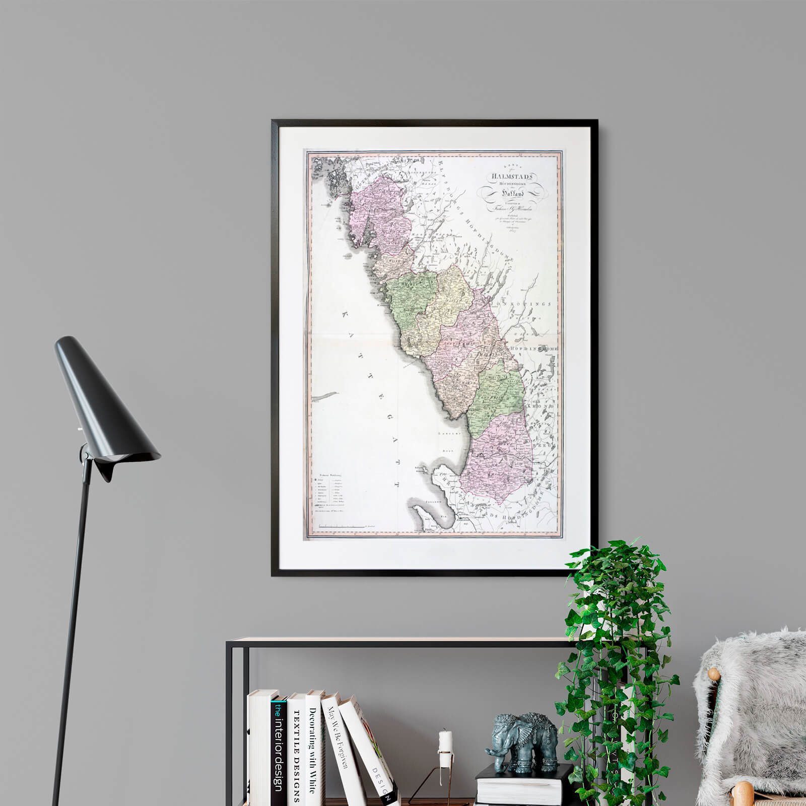 Poster med en karta över Halland och dess omgivningar år 1807. På kartan ser vi allt från Hönö, Göteborg, Härryda och Bollebygd i norr till och Höganäs, Ängelholm och Fagerhult i Syd. Markerat i färg i mitten ser vi Halland, eller Halmstad som hela området hette på tidigt 1800-tal. Uppe till höger på kartan ser vi texten: "Karta öfver Halmstads höfdingdöme eller Halland". En fantastisk bild över en stor del av Sveriges västkust.