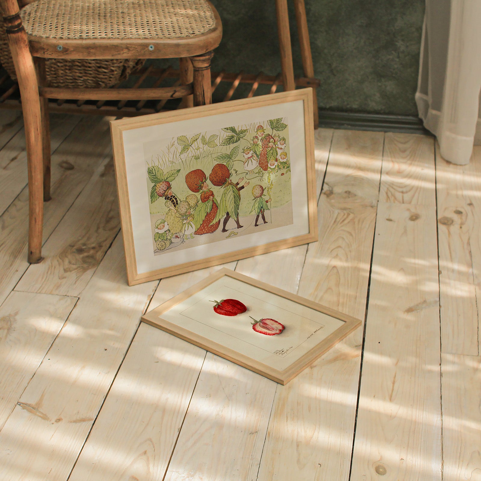 Poster med illustration av jordgubbar från tidigt 1900-tal. Jordgubben tillhör familjen Rosaceae och släktet Fragaria. Trots sitt namn är den inte ett "riktigt" bär enligt botanisk definition eftersom dess frön ligger på utsidan av frukten.