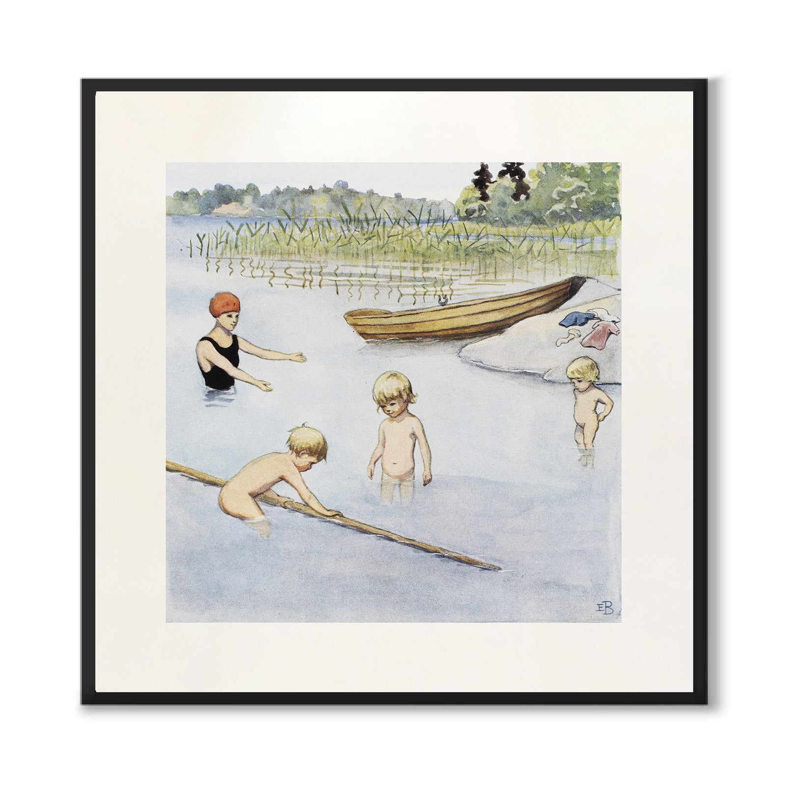 Sjön är stilla som spegelglas, speglar mäsarnas vingar. Se, nu rodde vi den i kras i månghundrade ringar! Brita ligger så lat i förn, sträcker makligt på benen. Vakna Brita, pass på, ta törn, båten skrapar mot stenen! Å, vad vattnet är härligt, säg, bättre kan man ej tänka! Lillan, skynda att doppa dej, annars måste vi stänka! Nej men titta! En mast så stor lätt på vågorna dansar! Den blir präktig till majstång, mor, klädd i blommor och kransar!