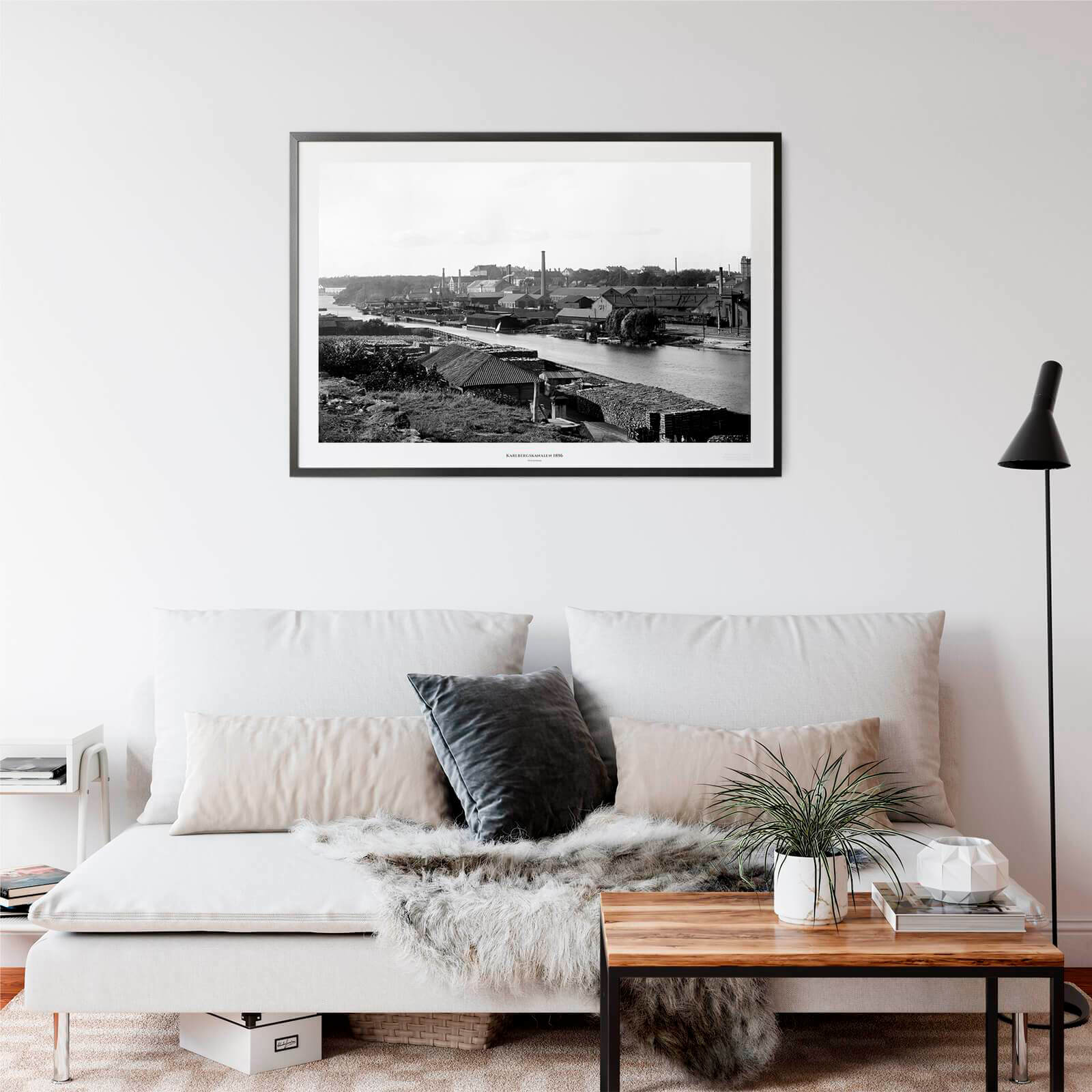 Utsikt över Atlas och Rörstrand längs Karlbergskanalen i Stockholm år 1896. Kungsholmen ligger i förgrunden. På bilden ser vi de stora industrianläggningarna som Vasastan var så känt för. Flera boende på Kungsholmen rodde dagligen över till Vasastan för att ta sig till sina arbeten på industrierna. På Kungsholmens sida ser vi stora timmerstockar staplade på varandra.