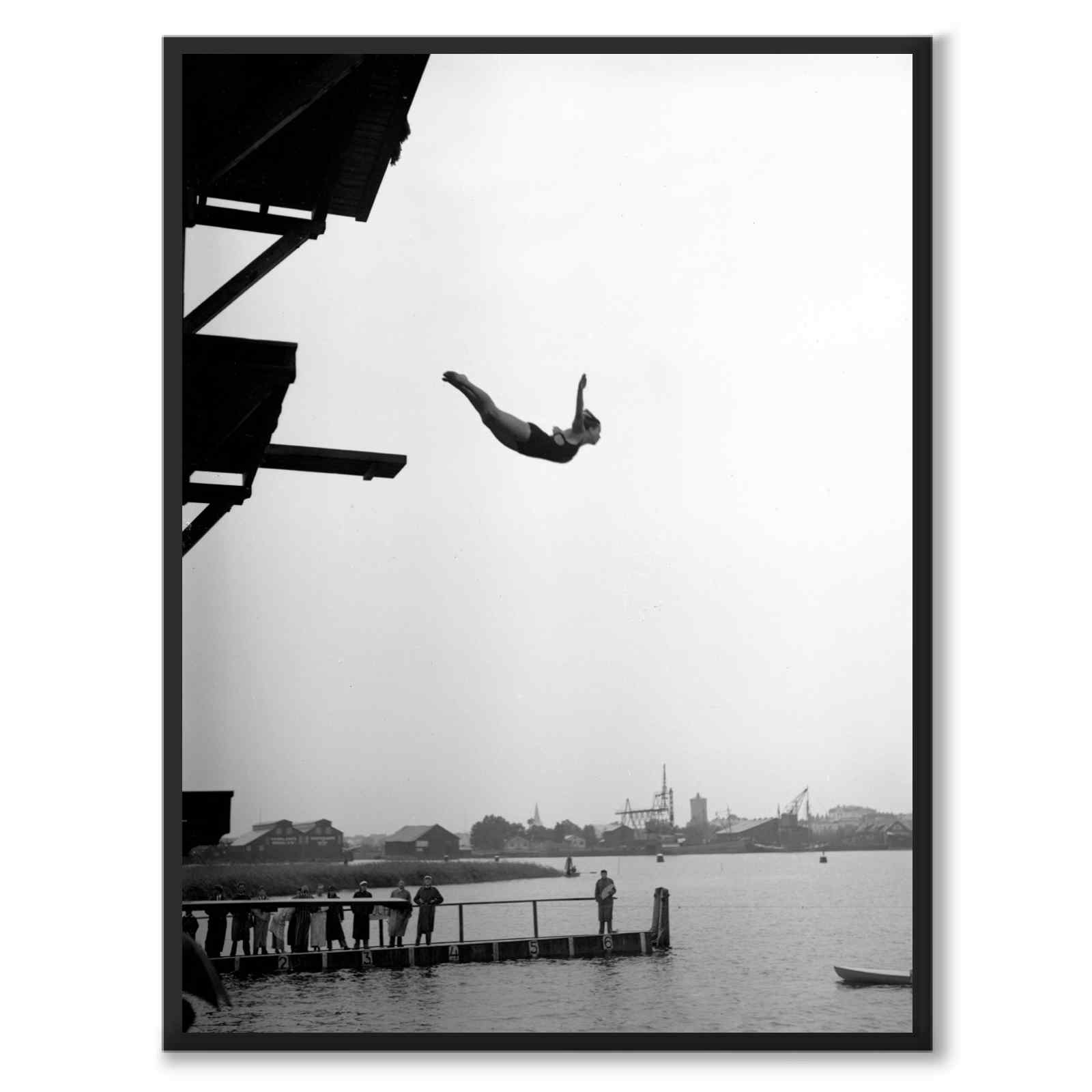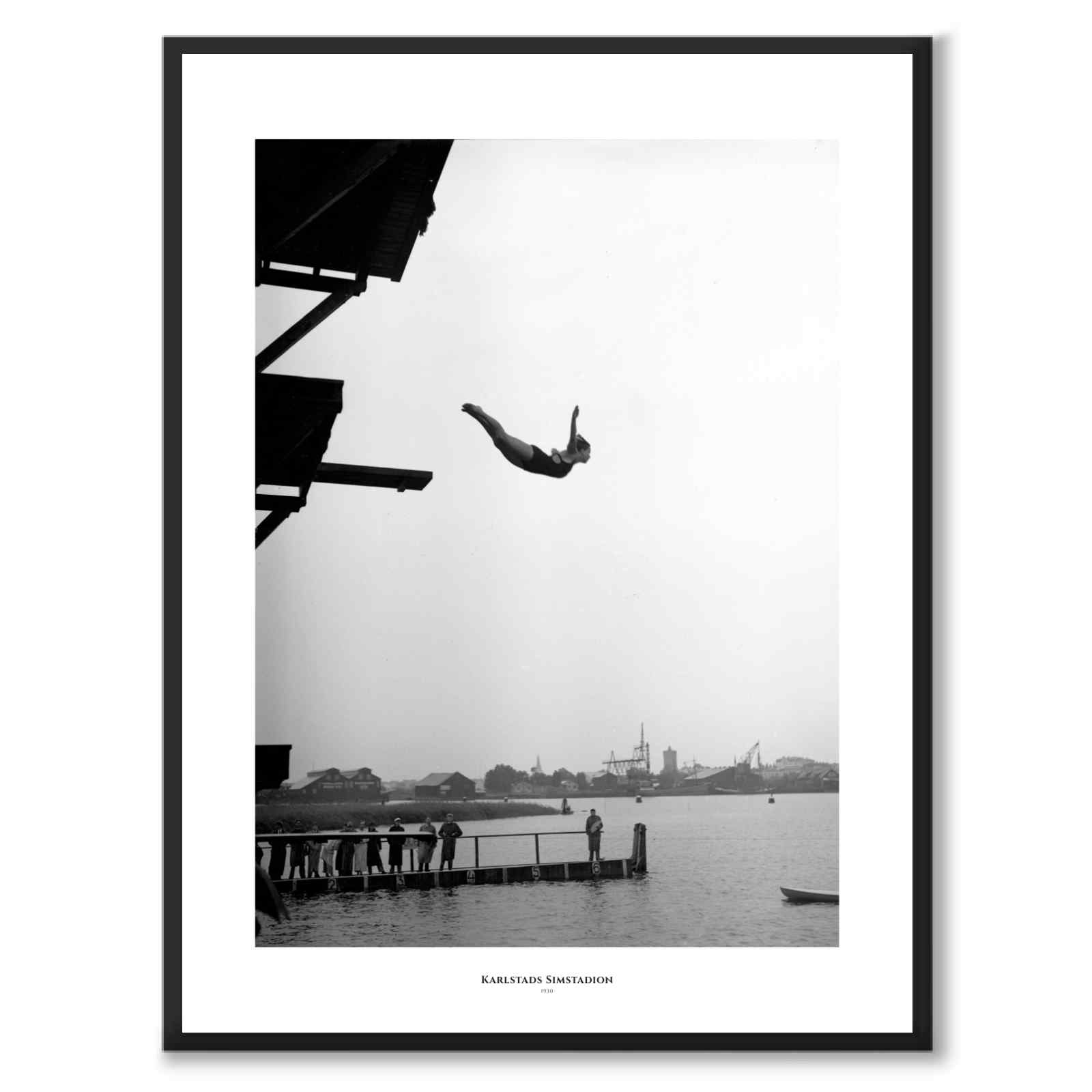 Poster med ett gammalt fotografi från Karlstads Simstadion. Den dåvarande anläggningen låg i anslutning till badholmens östra sida, söder om Kanikenäset. Badet invigdes år 1923 men togs sedan ur bruk och revs år 1943 på grund av dålig vattenkvalité. En liknande konstruktion, som ersatte den på bilden, byggdes upp i Örsholmstjärnet i början av 1950-talet.