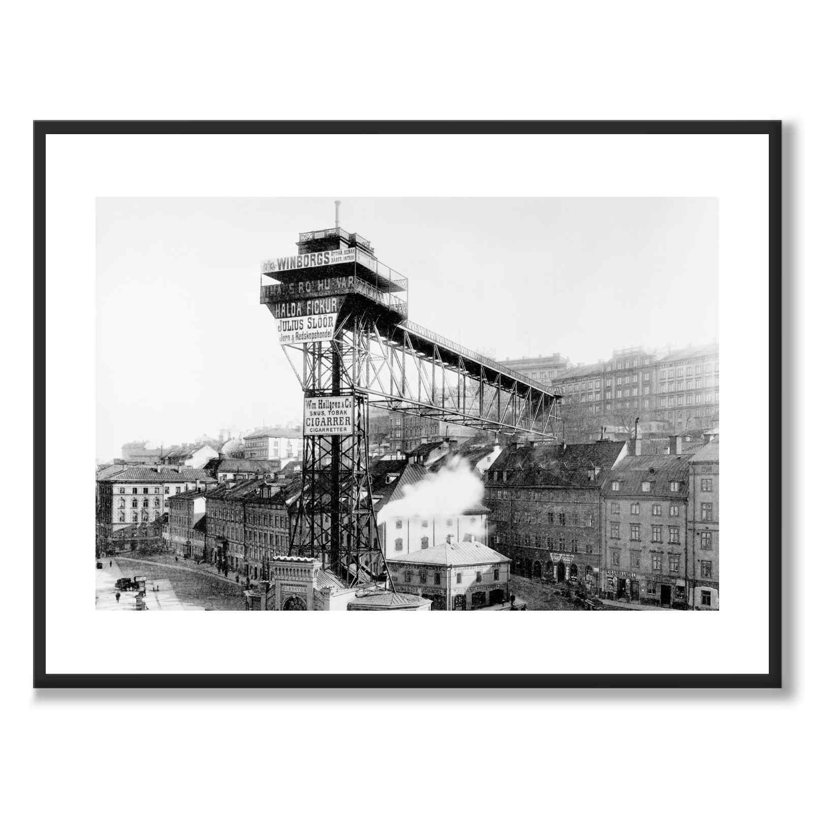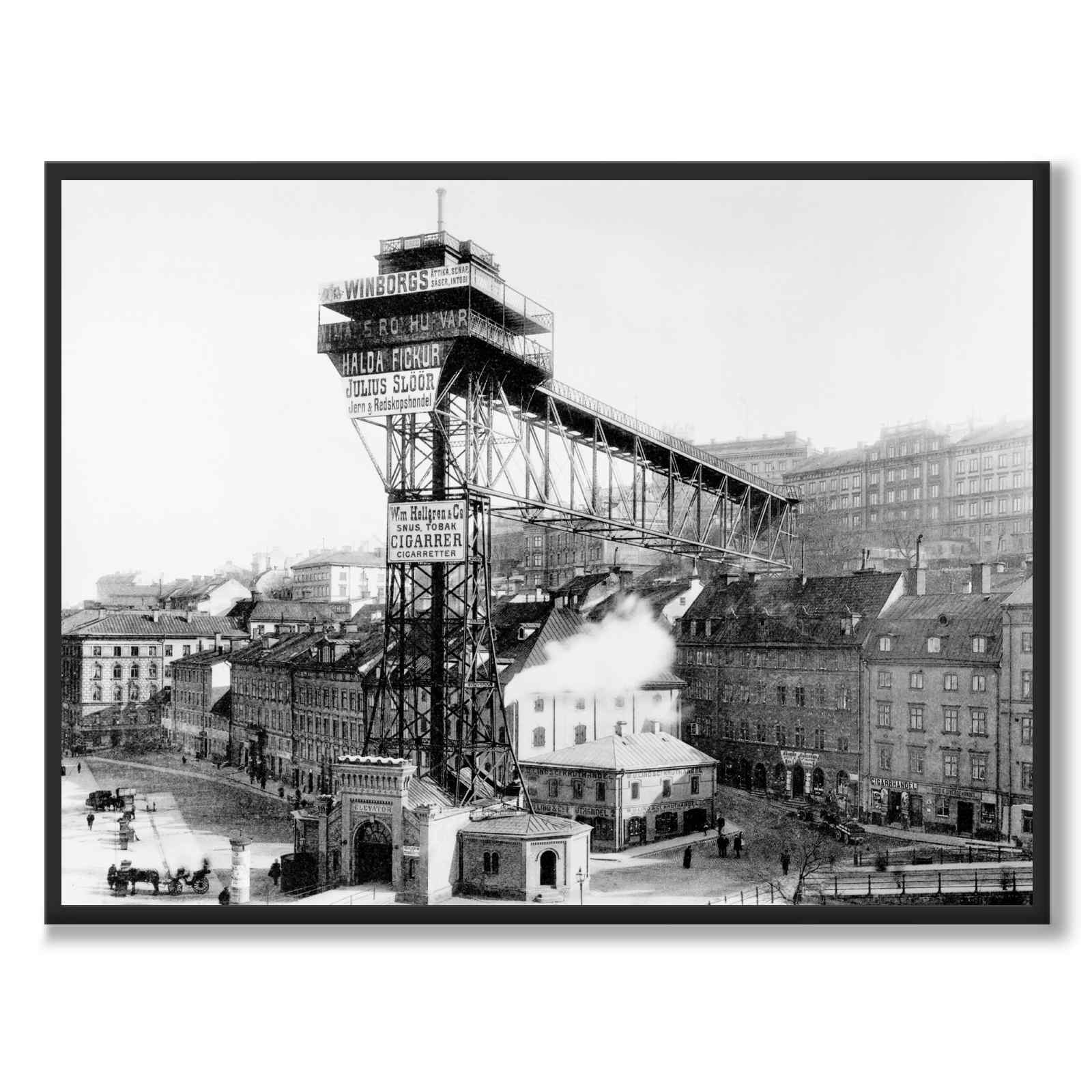 Katarinahissen sedd från Slussen någon gång mellan 1890-1910. Katarinahissen är inte bara en offentlig hiss utan även Stockholms mest kända hiss. Hissen och dess gångbro mellan Stadsgården och Mosebacke byggdes av ingenjör Knut Lindmark för att göra det enklare för människor att ta sig fram. Hissen invigdes år 1883. Det kostade 5 öre för uppfärd med hissen och 3 öre för nedfärd.
