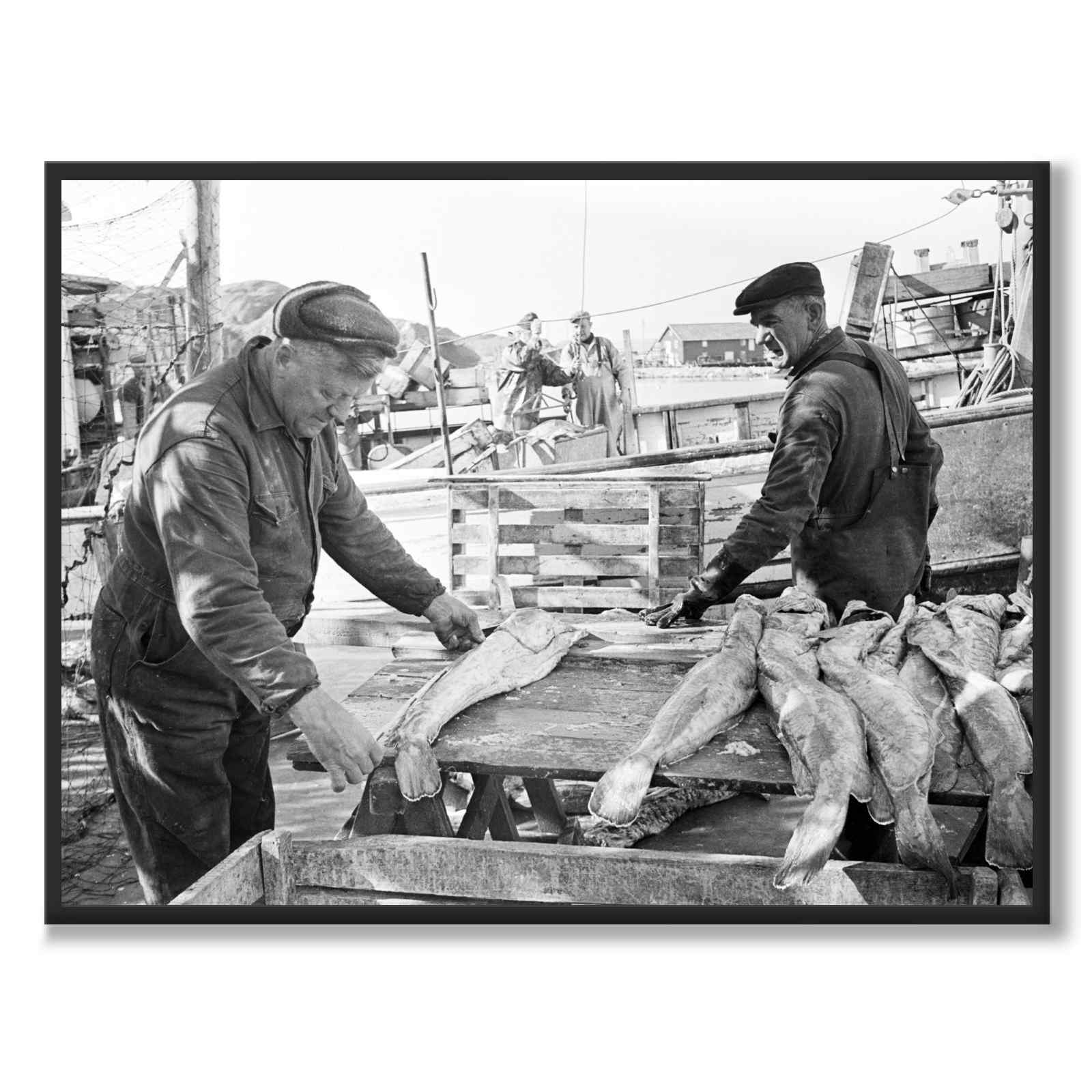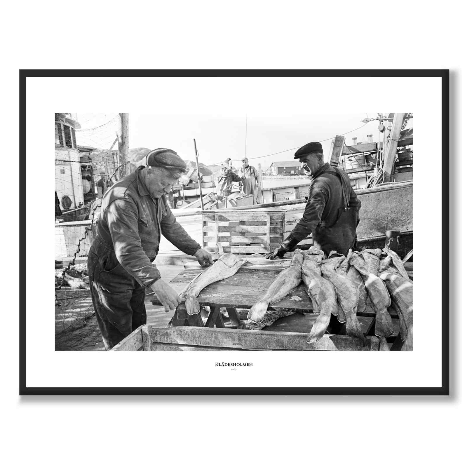 Poster med ett fotografi av Klädesholmen från år 1965. Det härliga fotot är taget av Terje Fredh. På fotot ser vi fiskare som hanterar fångsten.