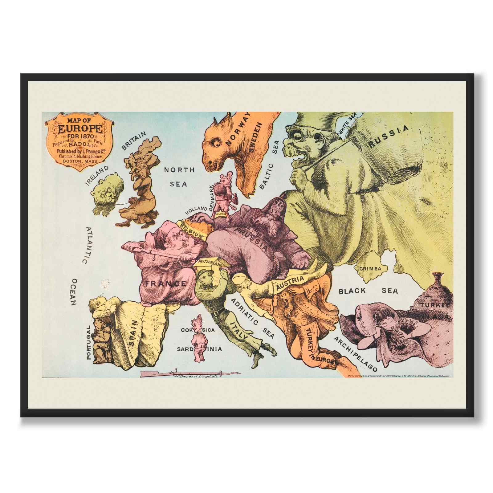 Poster med en krigskarta över Europa, sedd genom franska ögonen. Kartan är illustrerad av den kända, franska kartografen Paul Hadol år 1870 och visar det fransk-tyska kriget som pågick mellan 1870-1871.