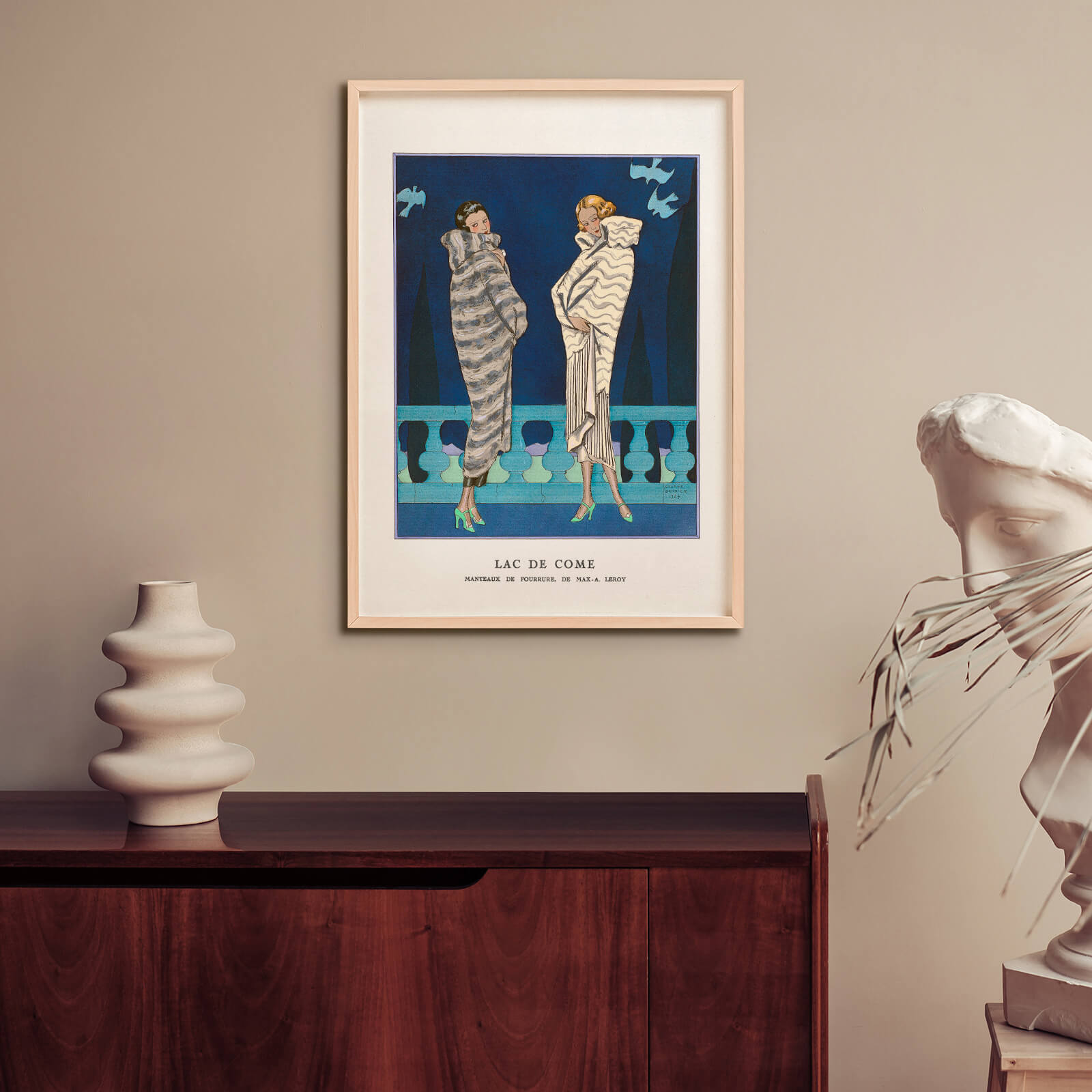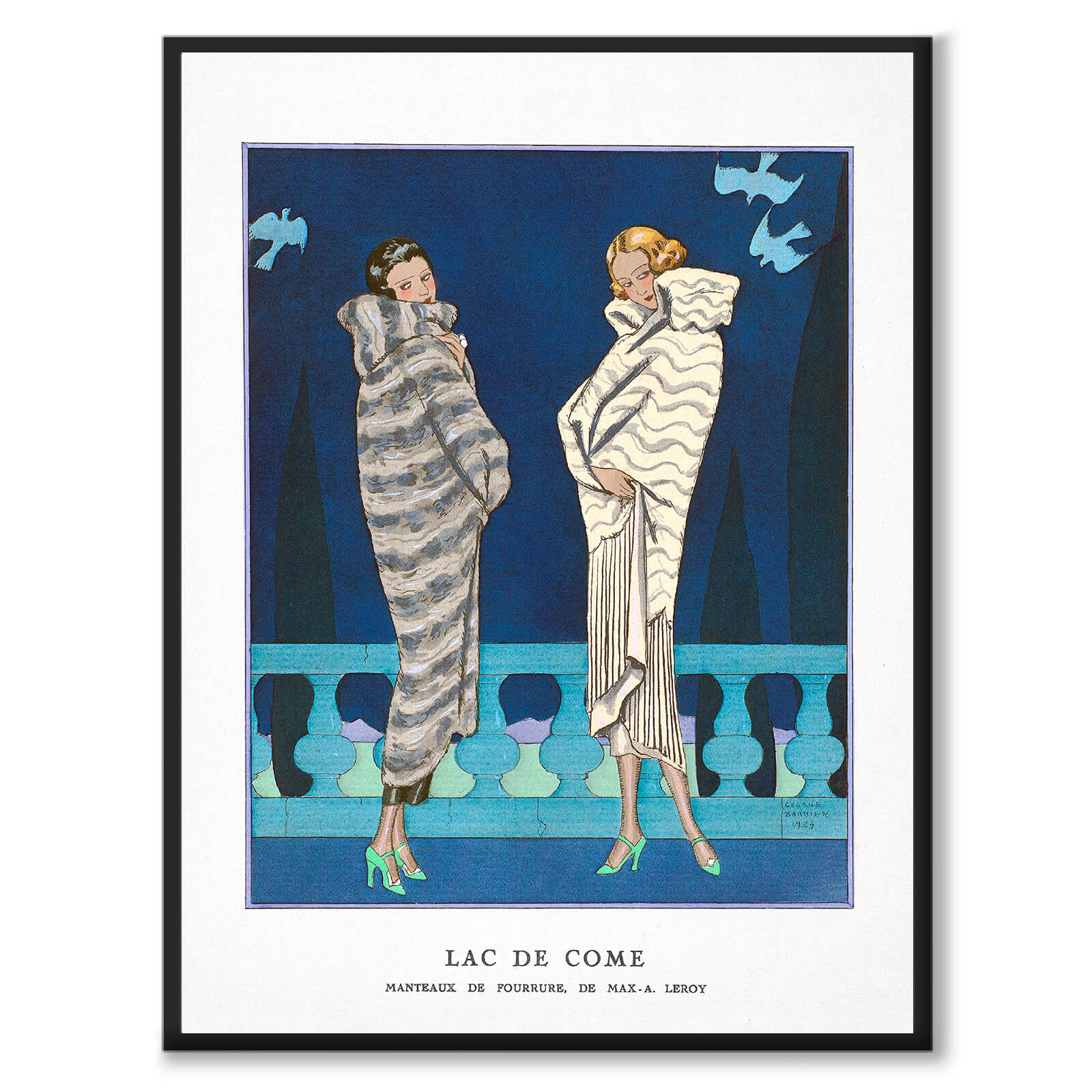 Poster med en illustration från ett franskt modemagasin år 1924. Ur illustrationen kan du läsa Lac de Come - Manteaux de fourrure, de Max-A. Leroy - franska för Comosjön. Pälskappor av Max-A Leroy.