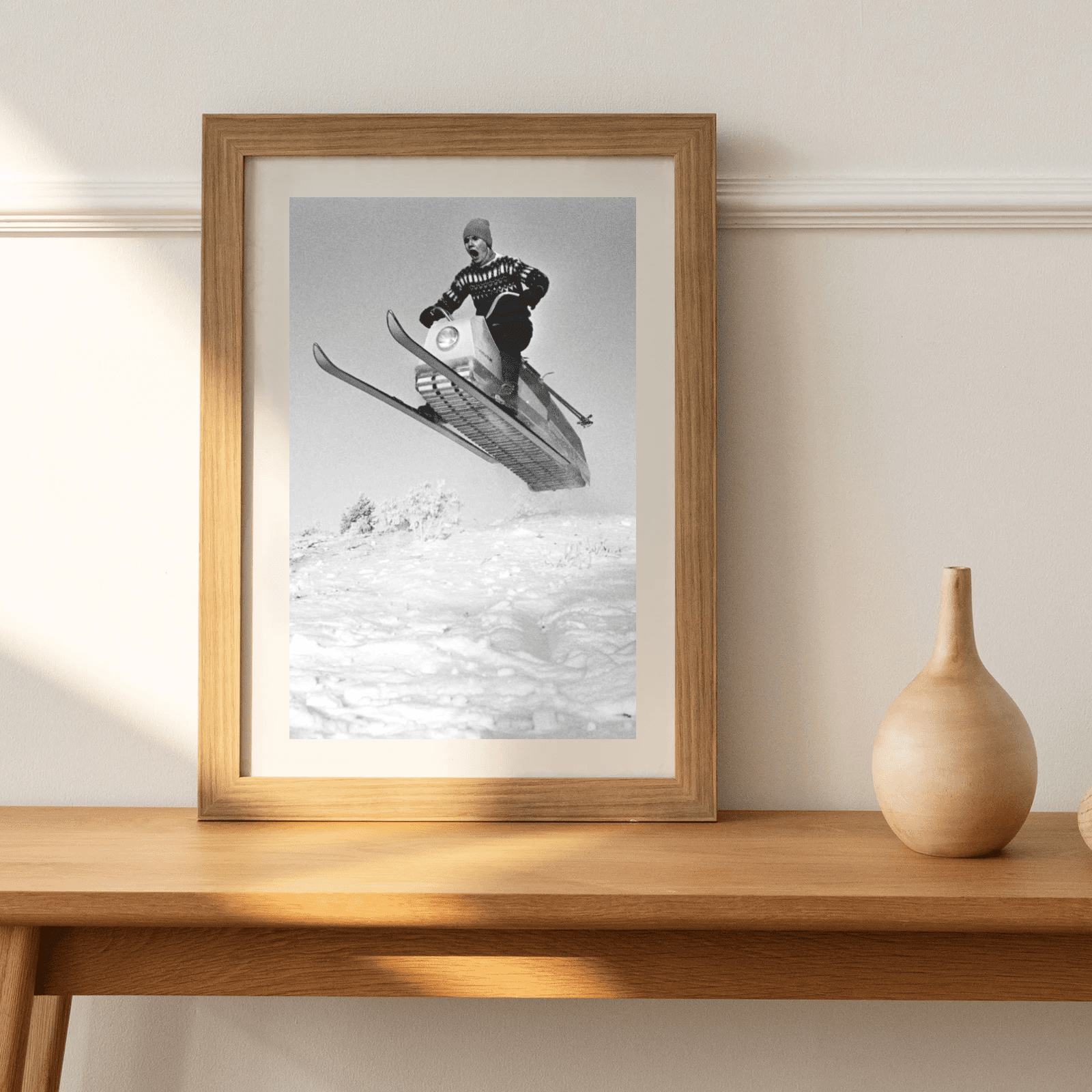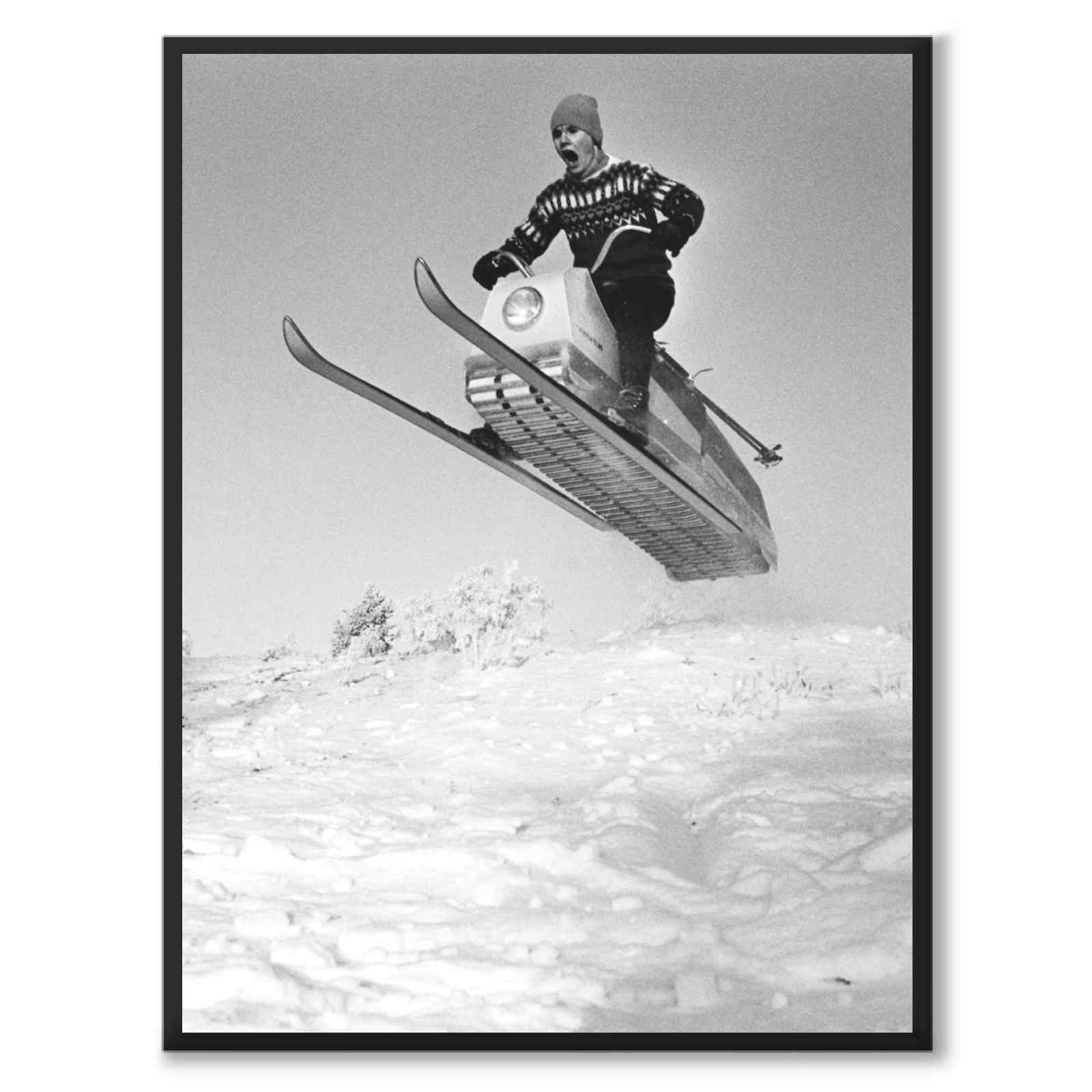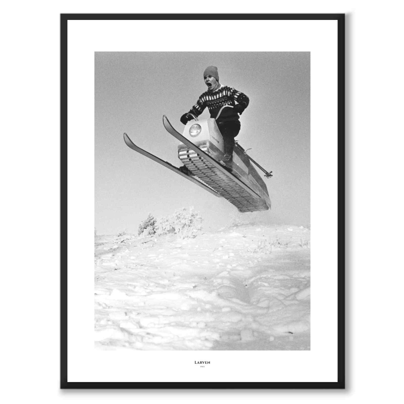 Poster med motivet Larven från 1965. Larven är en svensk okonventionell snöskoter som nu har uppnått kultstatus för sin unika design.