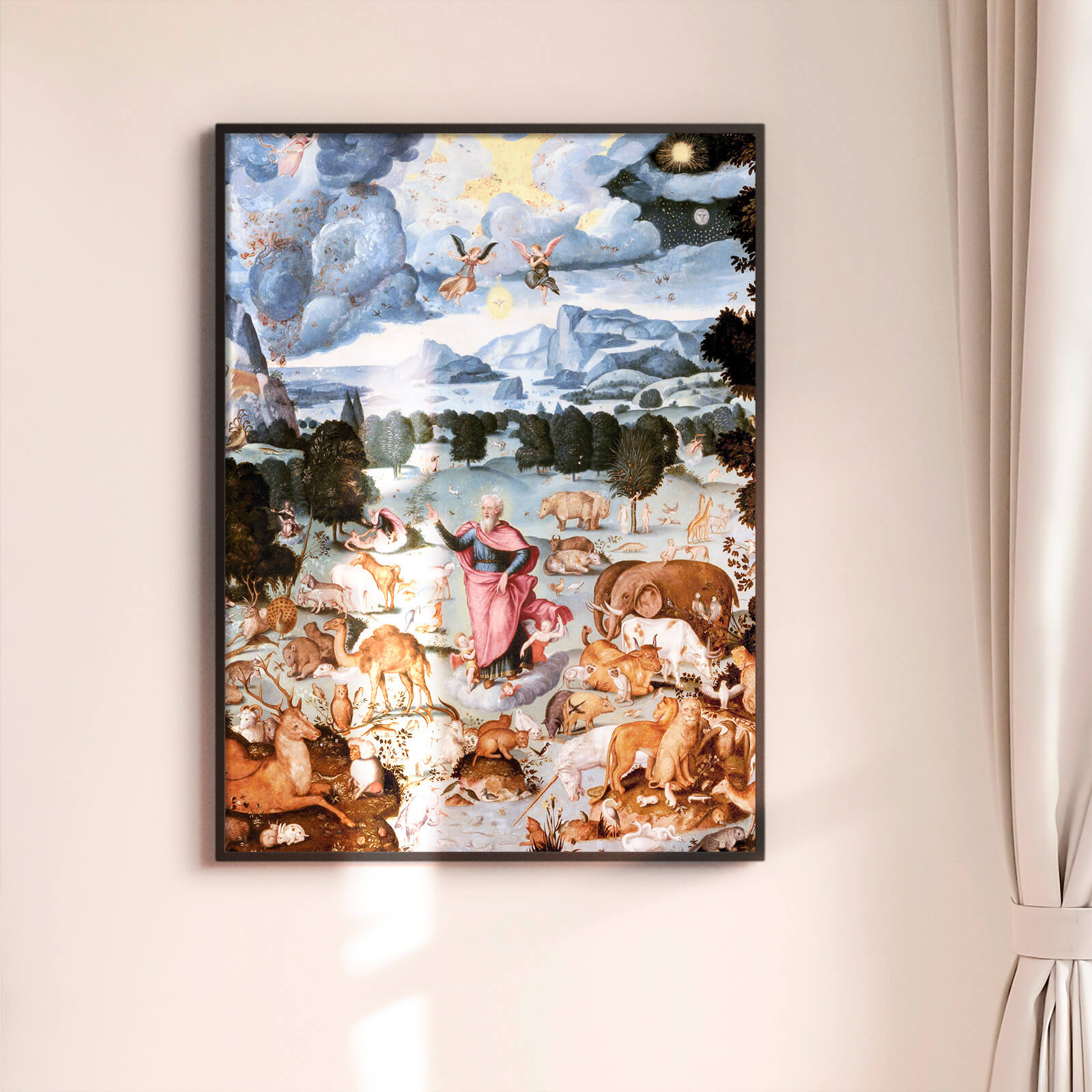 Motivet avbildar en scen från det Gamla Testamentet med gud, änglar, och en rik natur med olika växter och djur. På bilden ser vi till och med flera fantasidjur och 'de två första människorna' Eva och Adam. Zooma in och se alla fantastiska detaljer!