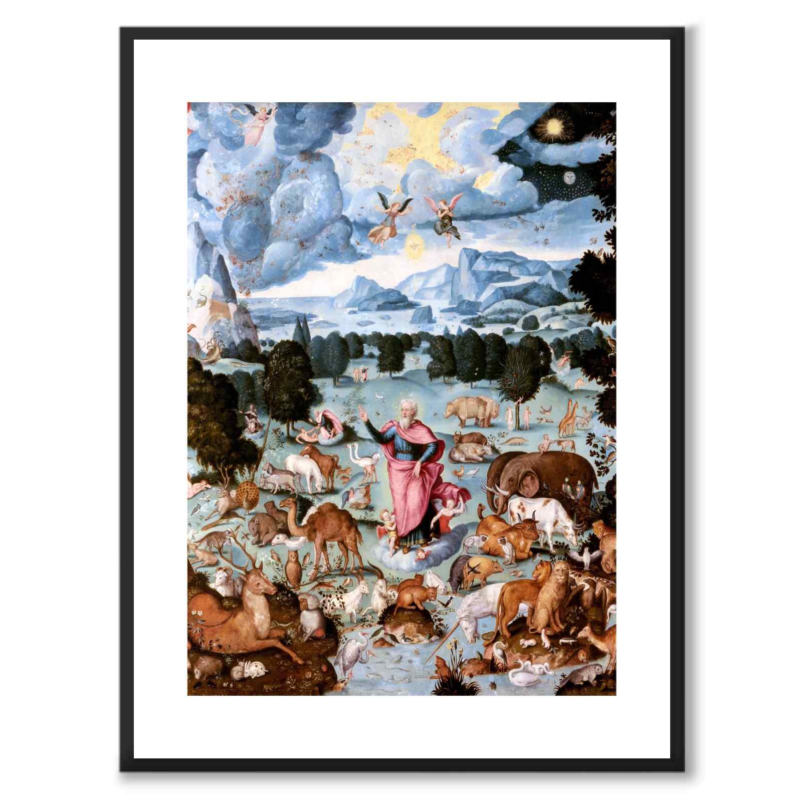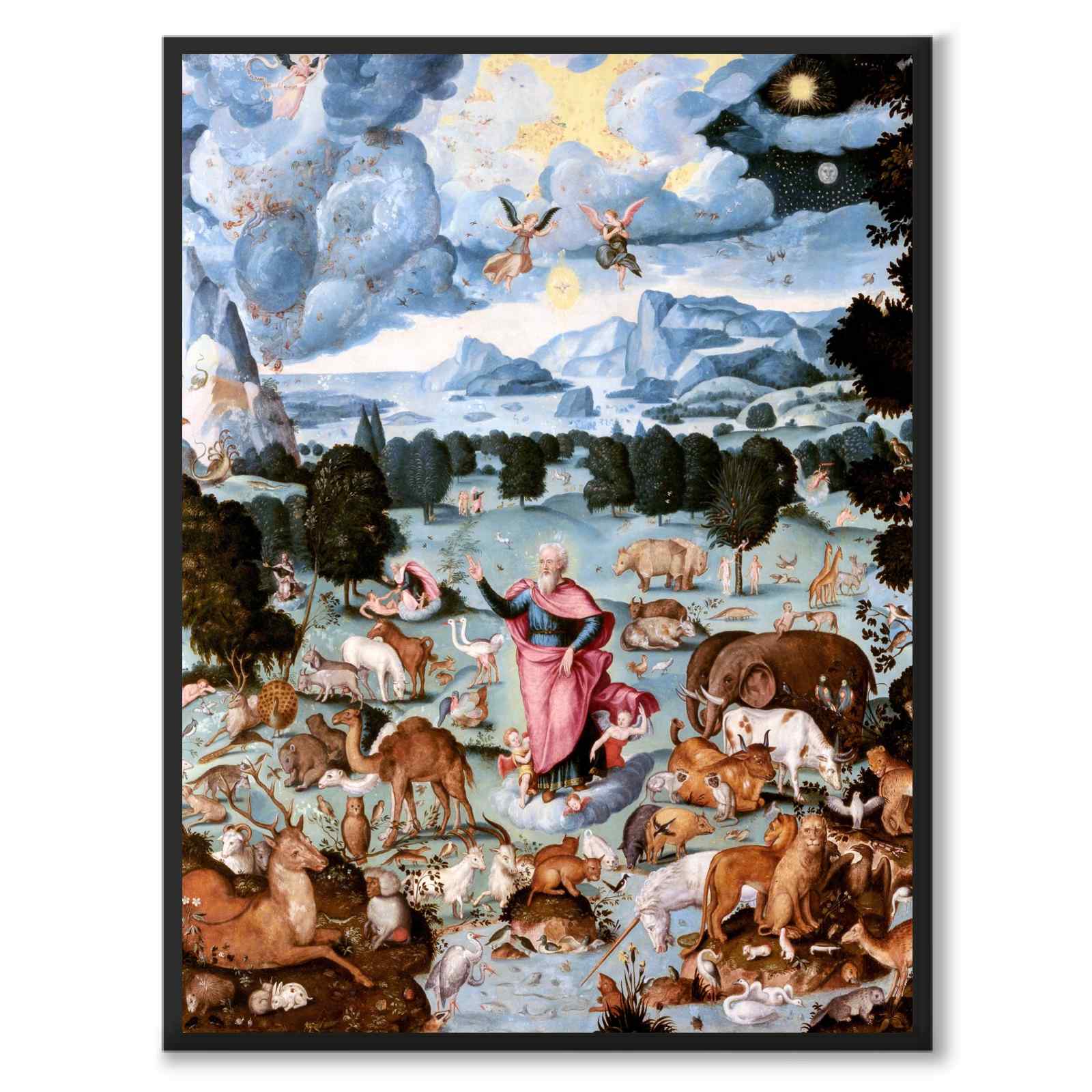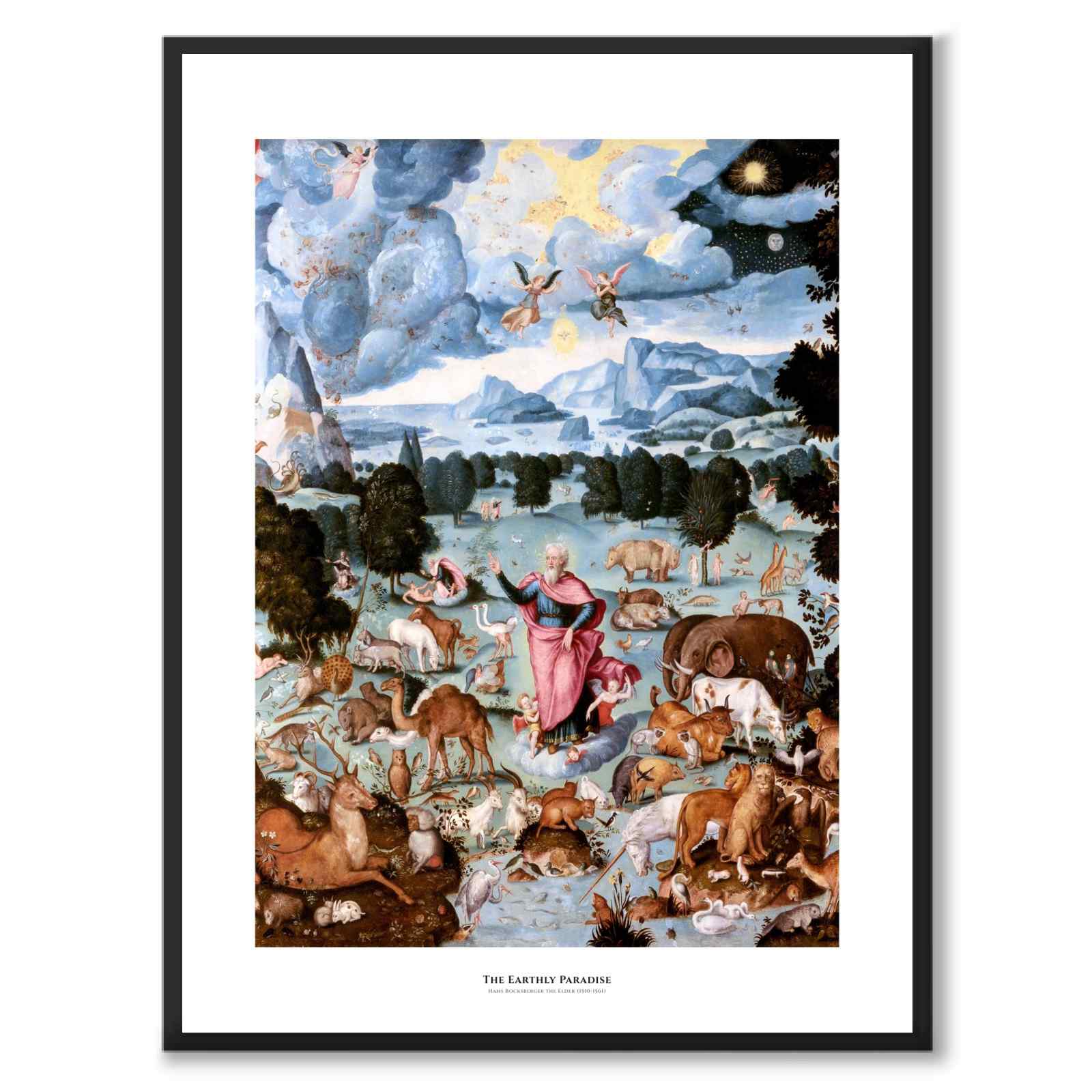 Poster med den otroligt detaljrika målningen Le paradis terrestre från 1500-talet av Hans Bocksberger den äldre (1510–1561). Bocksberger var en konstnär från Österrike som var verksam under Renässansen.