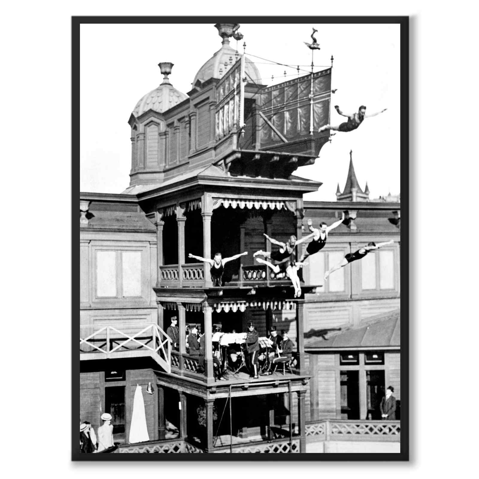 Strömbadet var det första kallbadhuset i Stockholm och låg på vattnet framför Stadshuset. Det var en vacker byggnad, byggd i renässansstil och skulle verka för stockholmarnas hälsa och simkunnighet. Skolbarn, poliser och brandmän hade fritt inträde, för övriga besökare var inträdet 35 öre. Strömbadet hade en avdelning för kvinnor, en för unga killar och den största, västra bassängen för simkunniga män. Det är denna avdelning du ser på fotografiet. Strömbadet var en plats för flera stora simtävlingar. På bilden ser du en simhoppsvisning någon gång mellan år 1900-1910. Ett imponerande fotografi av Axel Malmström som visar män som simultant gör olika avancerade simhopp. En man hoppar med ryggen mot oss: ett avancerat hopp som verkar vara i pik. På bilden ser du också en en orkester som spelar på andra planet.