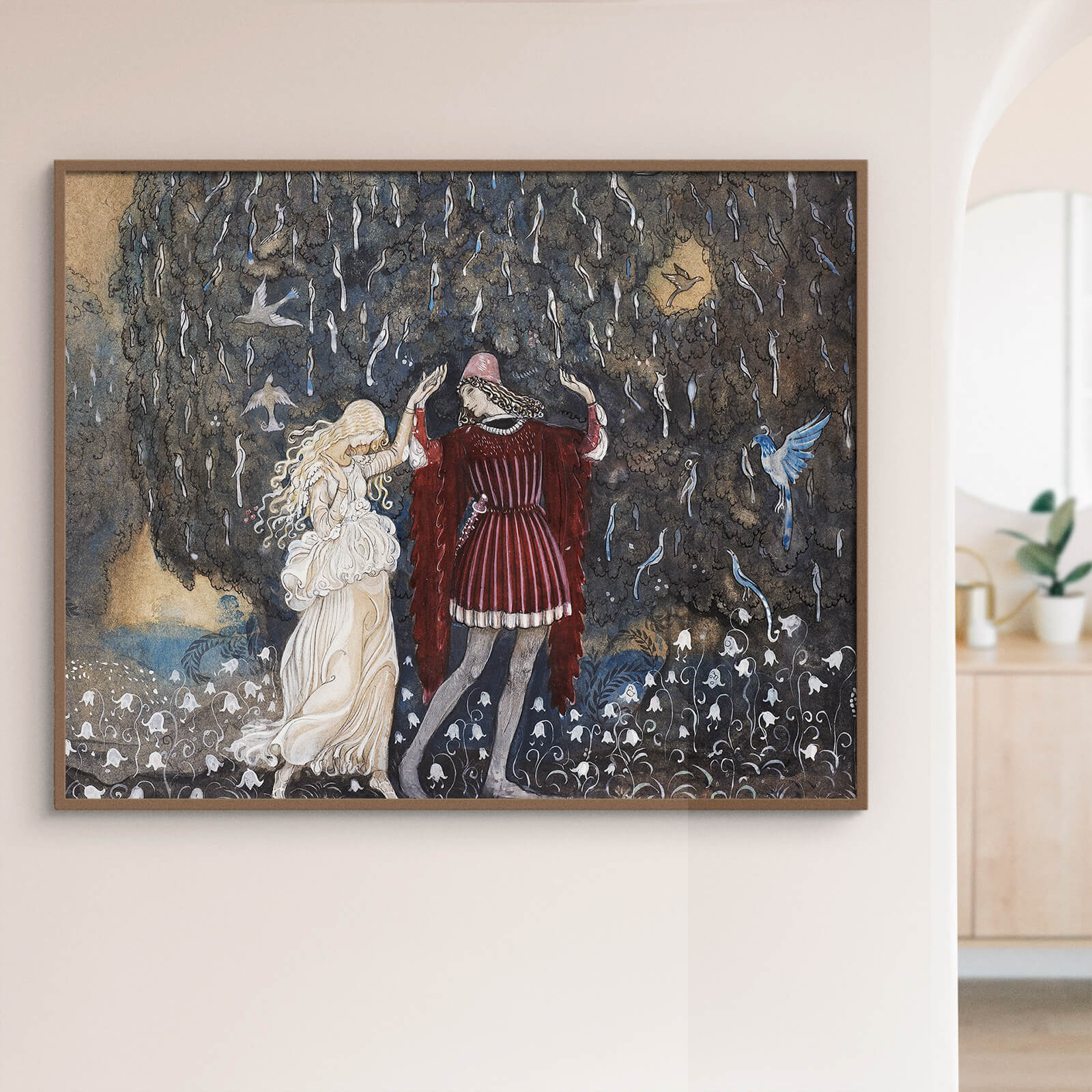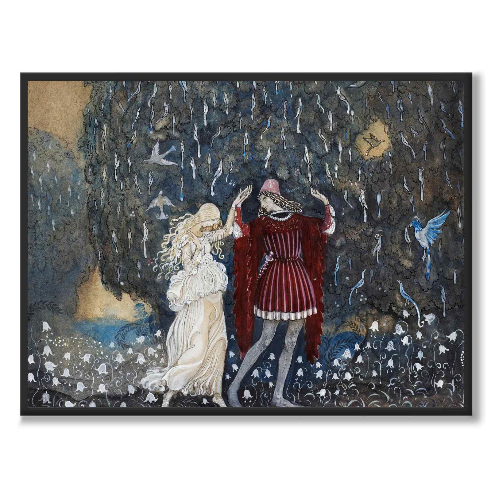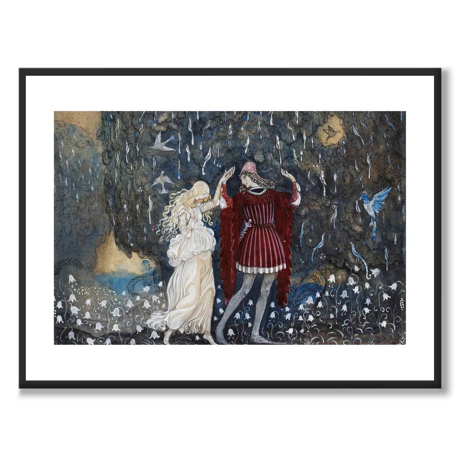 Poster med målningen Lena och Riddaren Dansa av John Bauer från 1915. Bilden var en illustration till W.E. Björks saga Guldnycklarna i sagosamlingen Bland tomtar och troll.