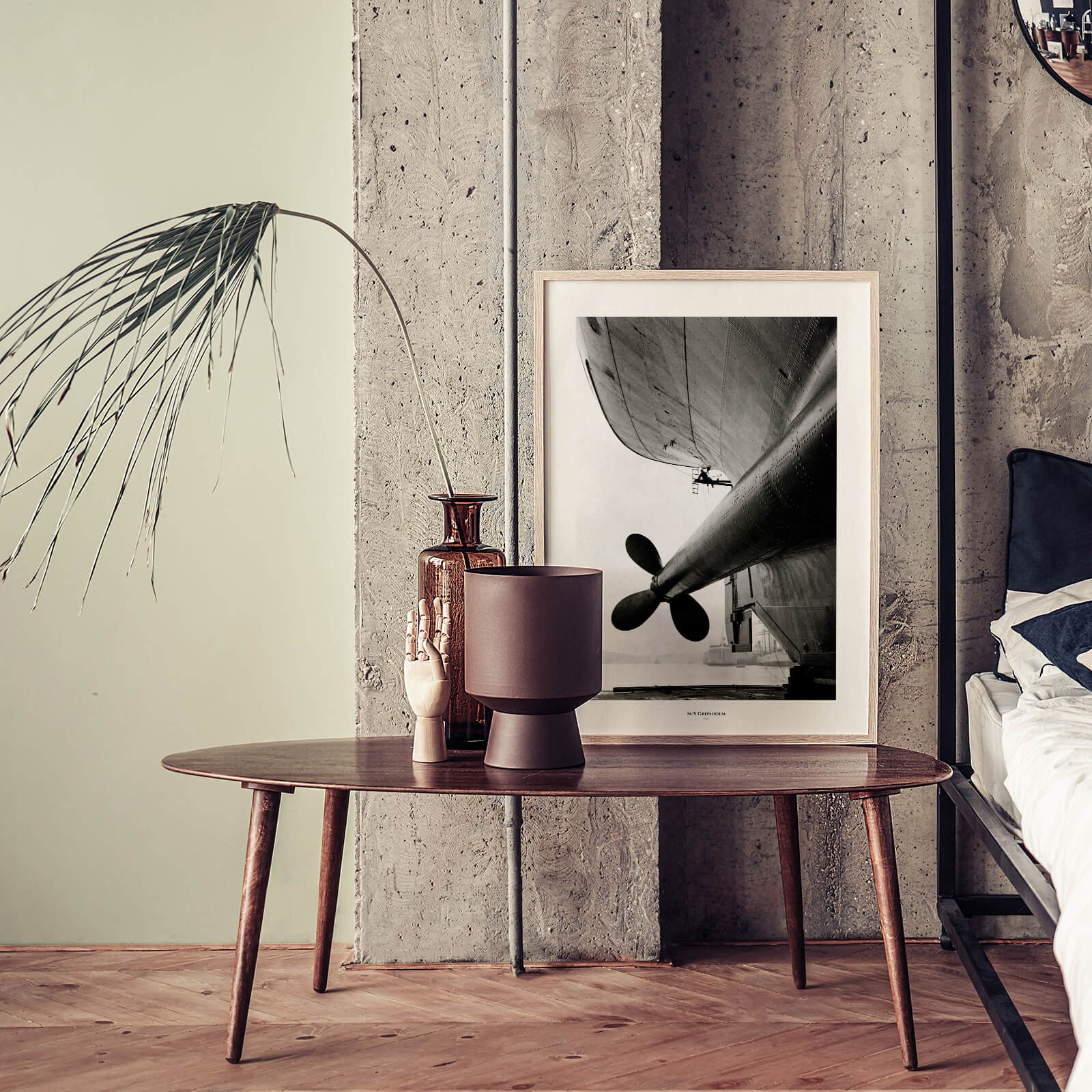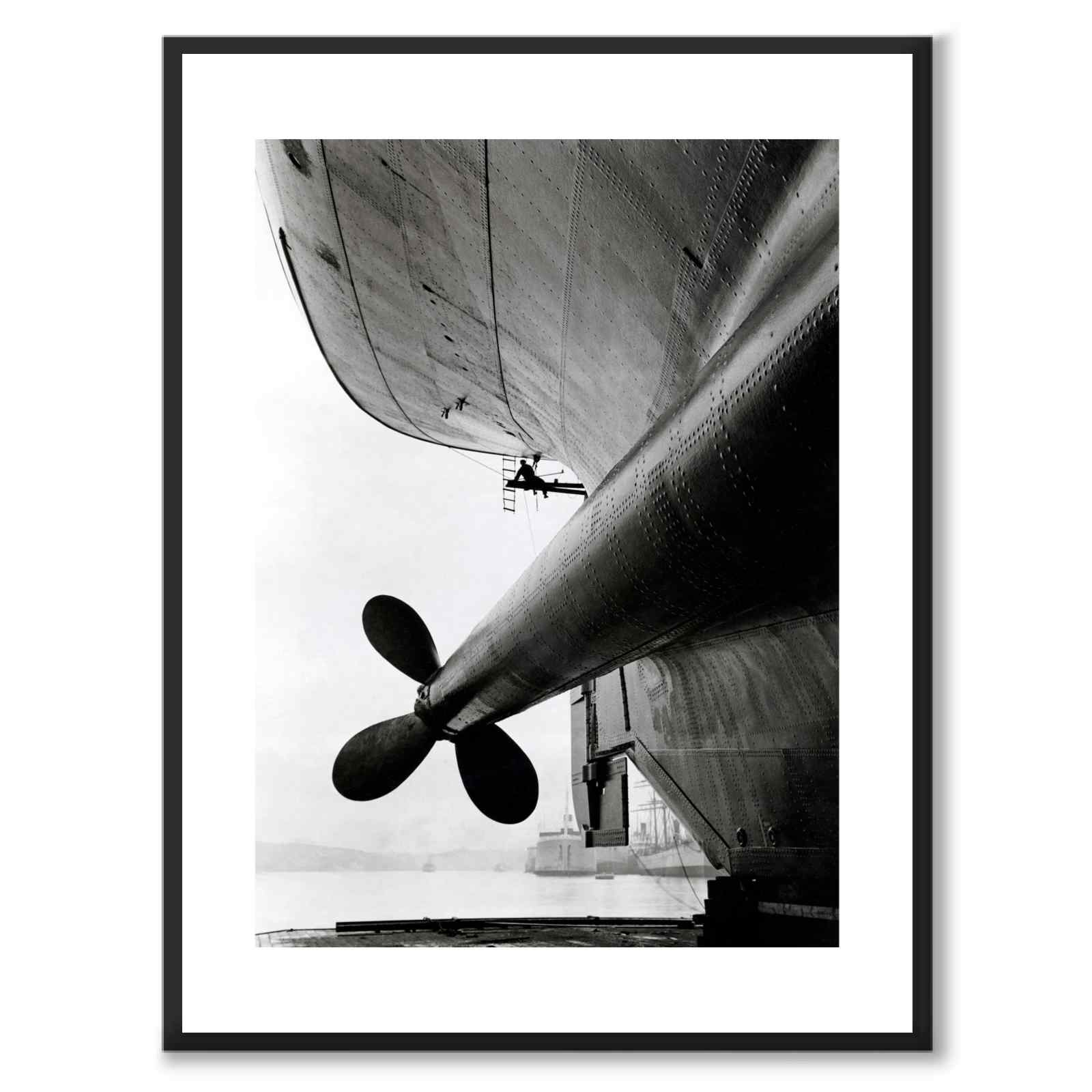 Poster med en bild av höger propeller samt roder på det kända fartyget M/S Gripsholm. Bilden är troligen från 1925 och tagen på varvet Armstrong, Whitworth & Co, Ltd i Newcastle i England där fartyget byggdes.