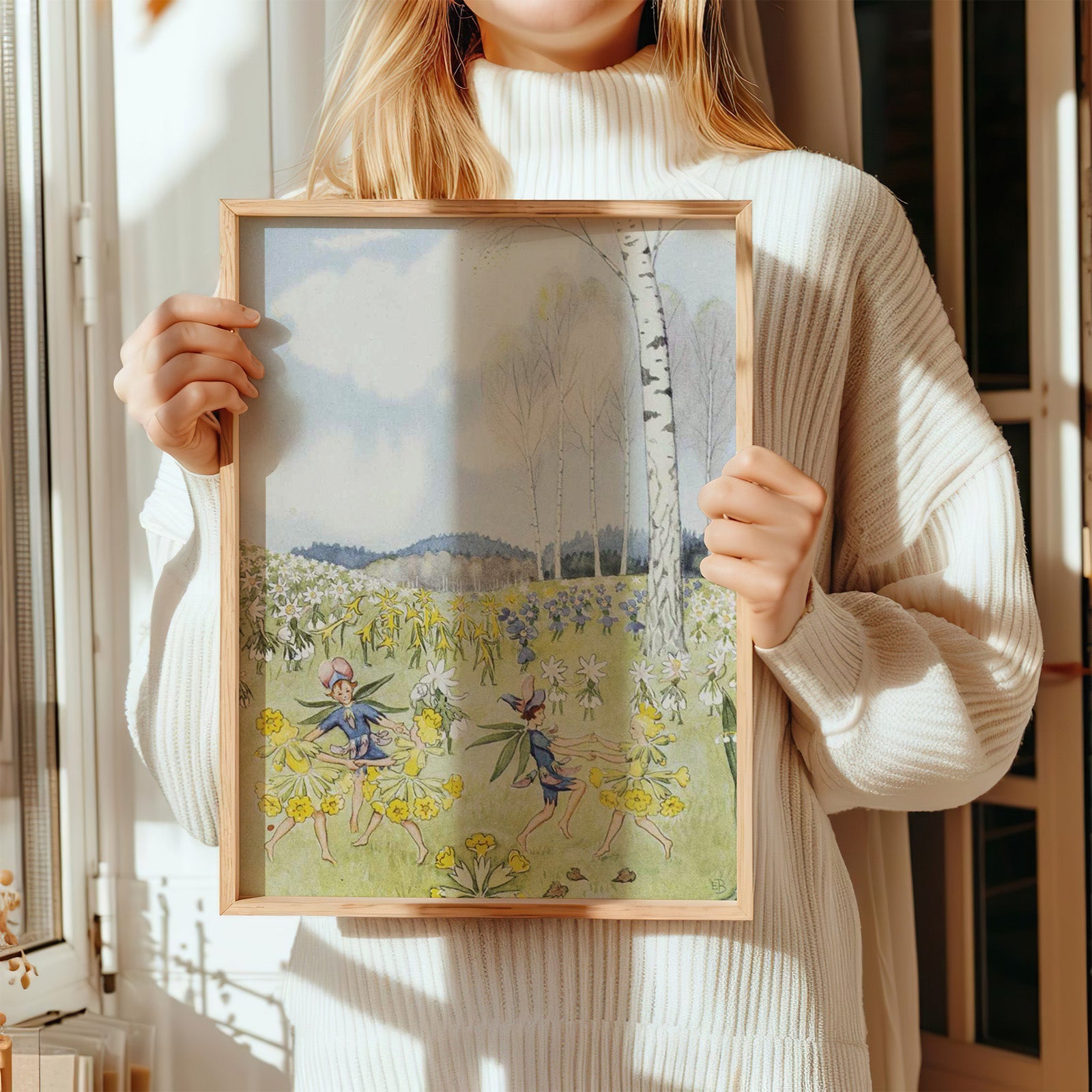 I boken står det: Kära fru Björk, stå inte mörk, slå ut dina ljusgröna lockar! Se hasselhängen och gullvivegull; se hela marken av vitsippor full och pilen som artigt bockar! Slå ut dina tusende ljusgröna blad, då först kan all världen bli glittrande glad!” Bedjande stå vårlökar små, violer med hatten på nacken. Nu skrattar björken, då brister var knopp. Se så, nu lyser hon grön i sin topp! Då blir det en glädje i backen. Se, gökört med gullvivor ta sig en sväng, snart ringer konvaljen med klockor på sträng.
