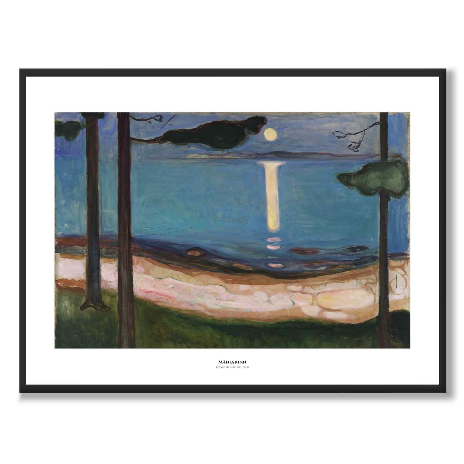 Målningen skildrar en scen vid vattnet där månen reflekteras på havsytan. Träden på sidan ramar in landskapet och Munch använder sig av starka färger i rosa och blått.