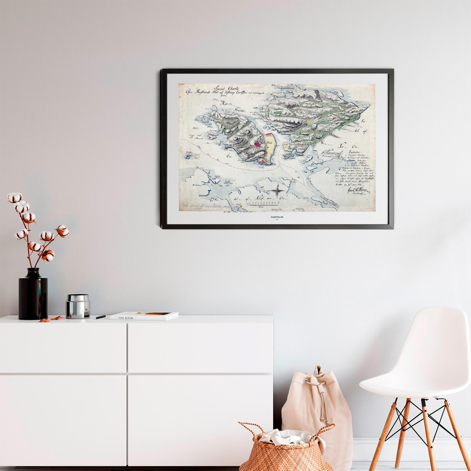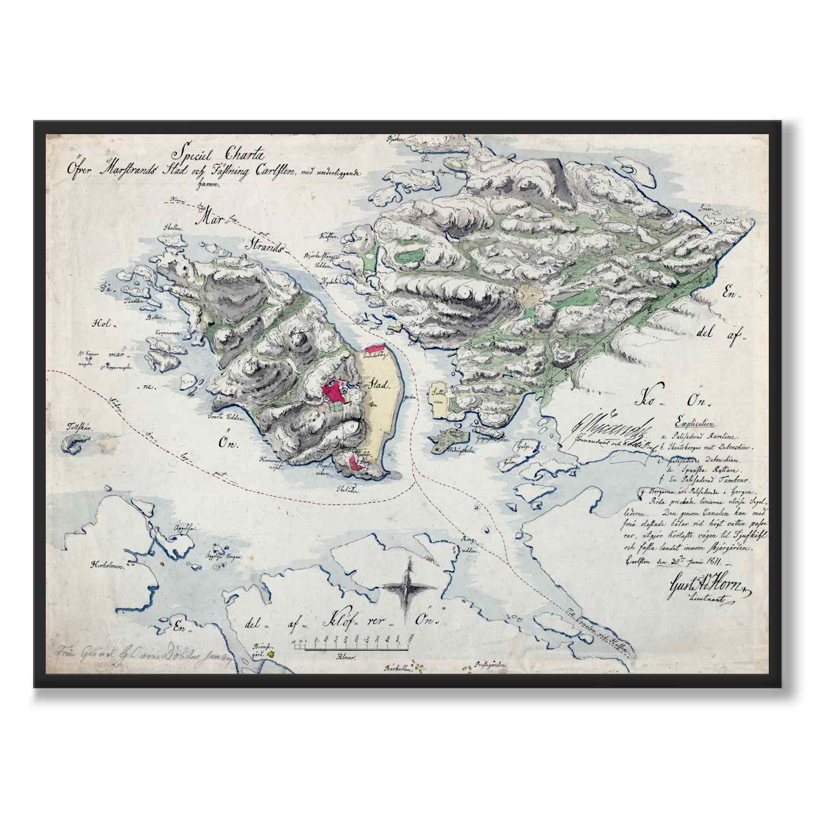 Poster med en gammal karta över Marstrand i Bohuslän år 1811. I övre vänster hörn ser vi texten Speciel charta öfver Marstrands stad och fästning Carlsten, med underliggande hamn. Kartan ritades av löjtnant Gustaf Ad. Horn den 30e juni år 1811. En fantastisk illustration av en av Sveriges mest älskade semesterorter på västkusten.