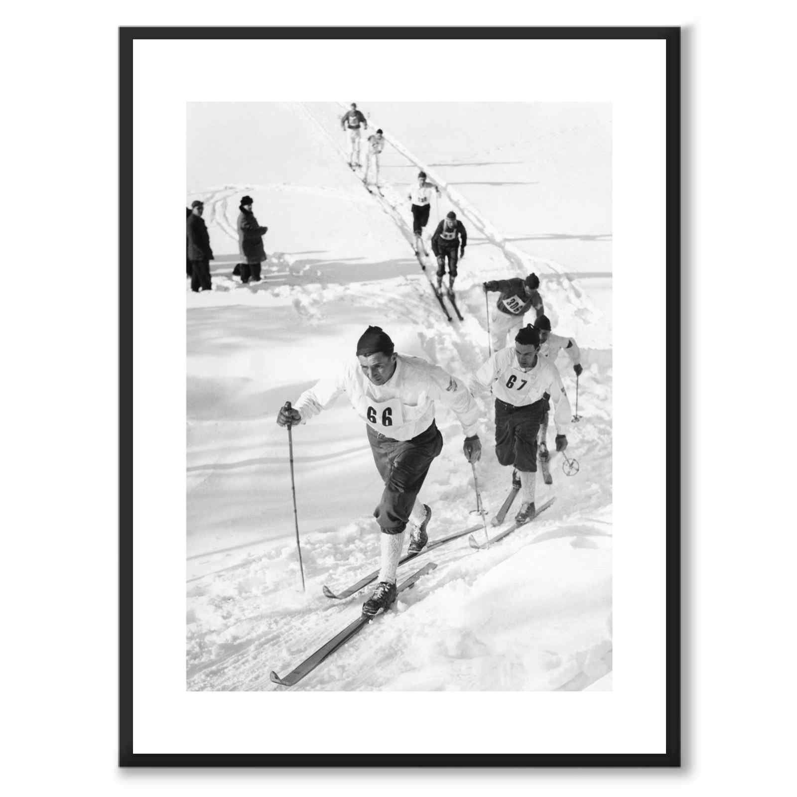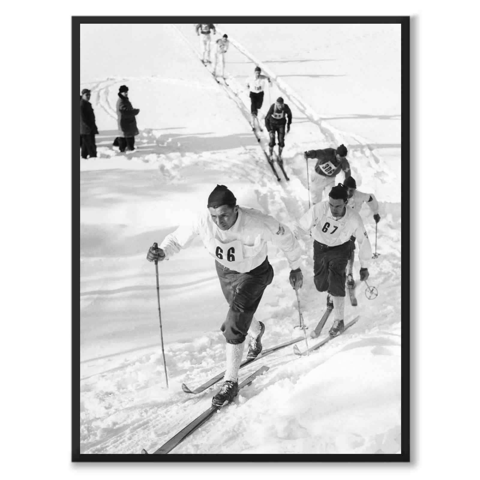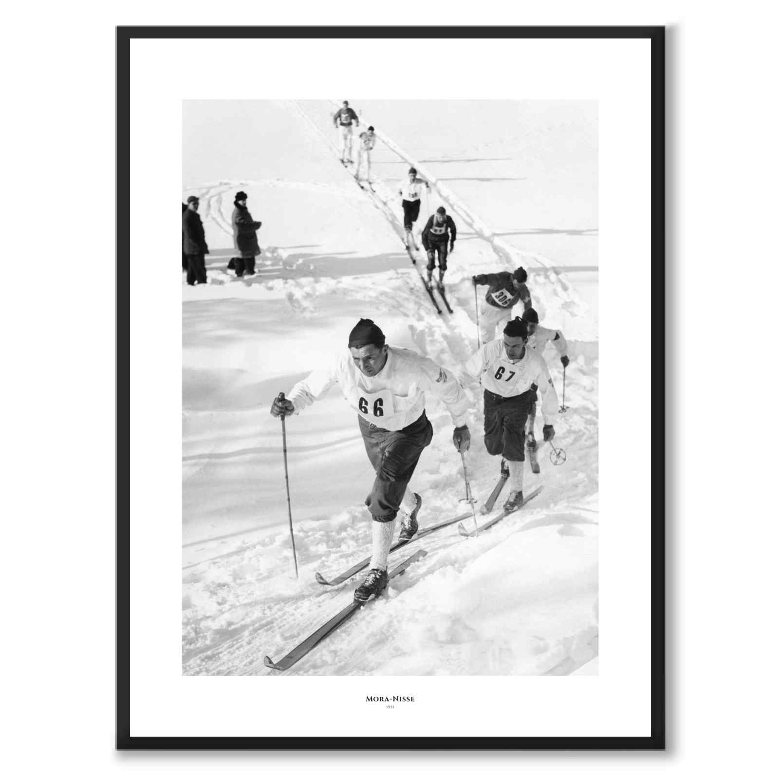 Poster med ett fotografi av skidlegenden Mora-Nisse Karlsson (1917-2012). Bilden är tagen under Vasaloppet 1951, där Mora-Nisse är först i spåret och Anders Törnkvist efter.