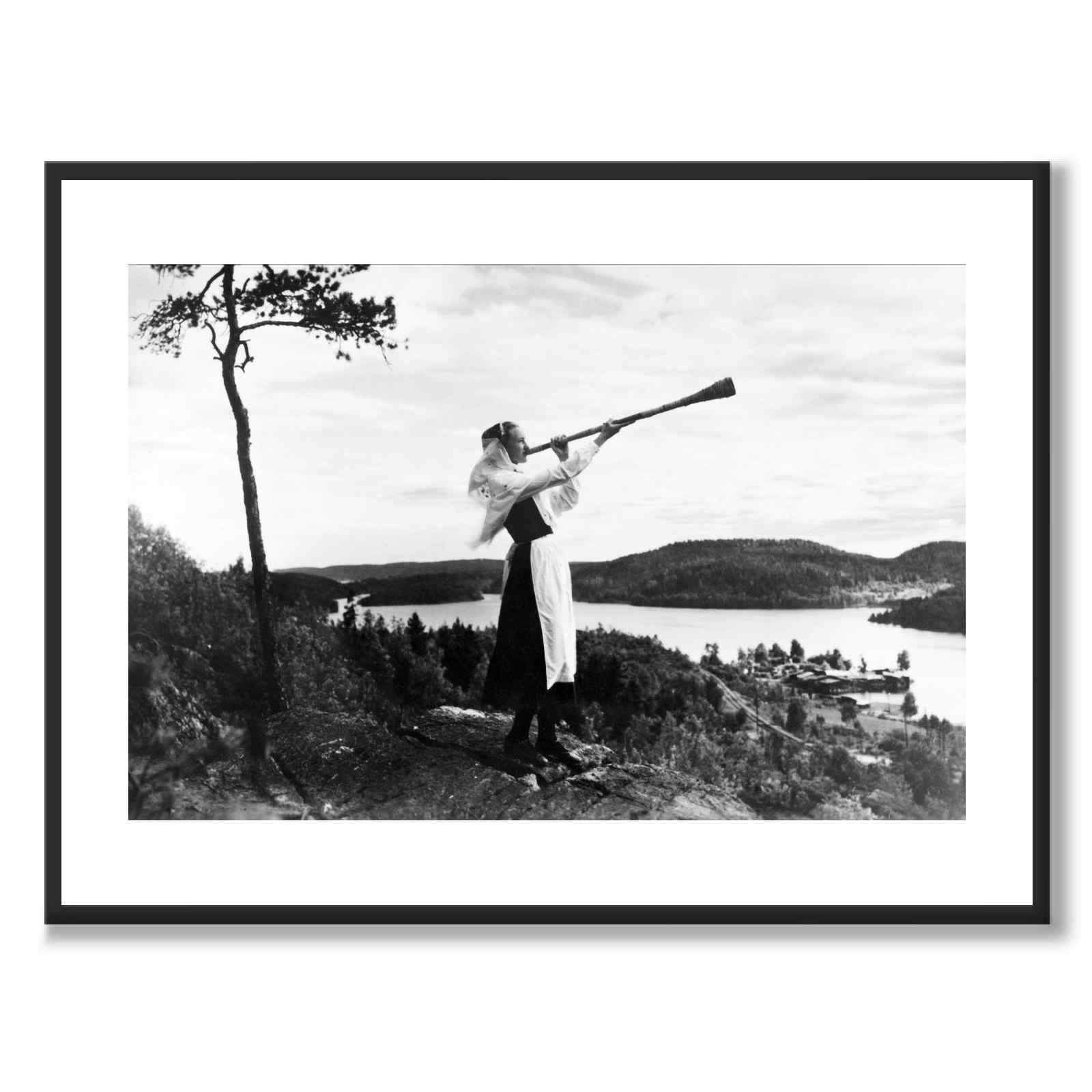 Poster med ett vackert fotografi taget under 1930-talet. Det gamla fotot är av en kvinna som spelar näverlur. Kvinnan står på ett berg med en fantastisk omgivning av skog och vatten, nere vid vattnet går det även att skymta en by.