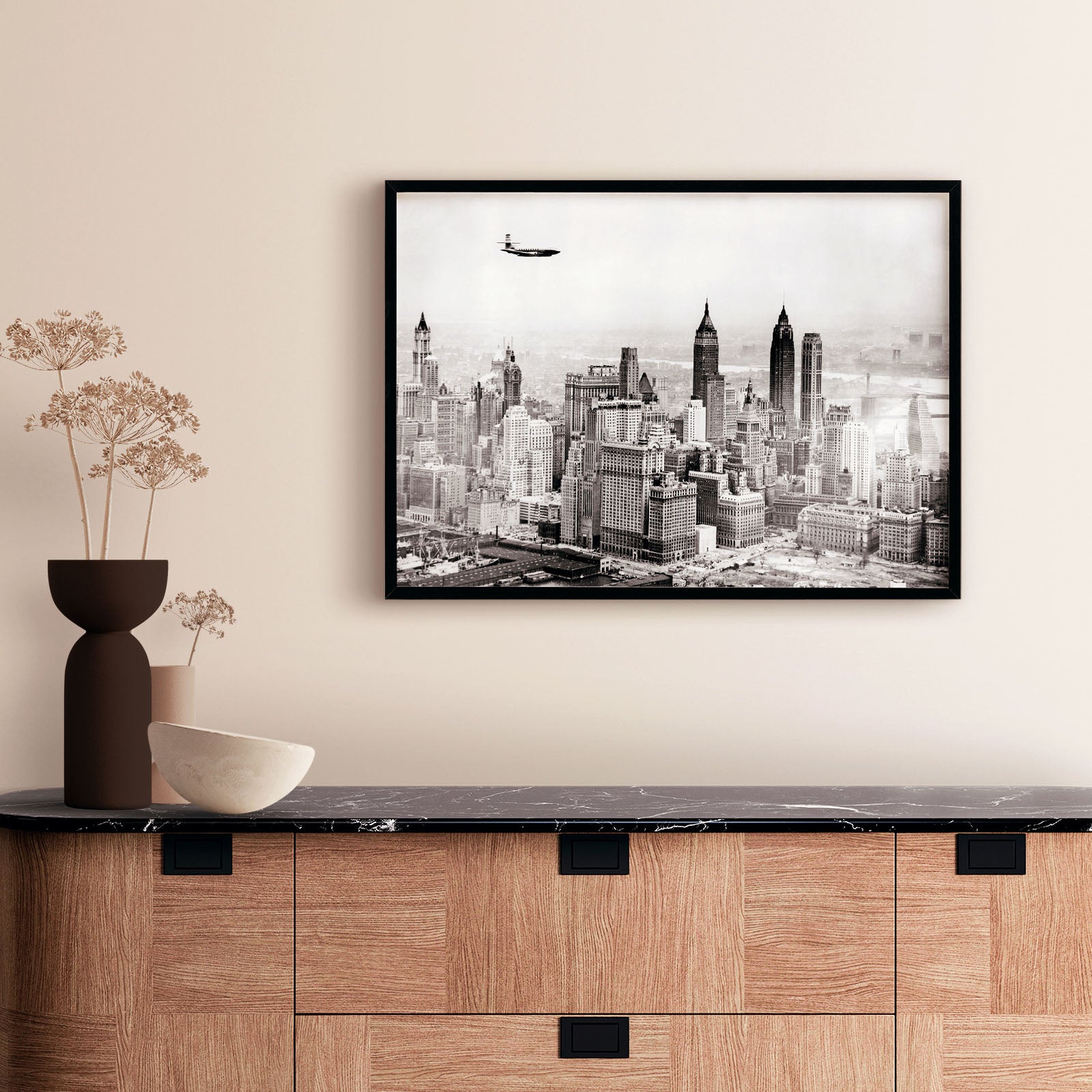 Poster med ett unikt foto från 1950 som visar New Yorks Skyline. På bilden syns ett flygplan samt ett antal ikoniska byggnader i den nedre delen av Manhattan. I förgrunden syns bland annat Battery Park.